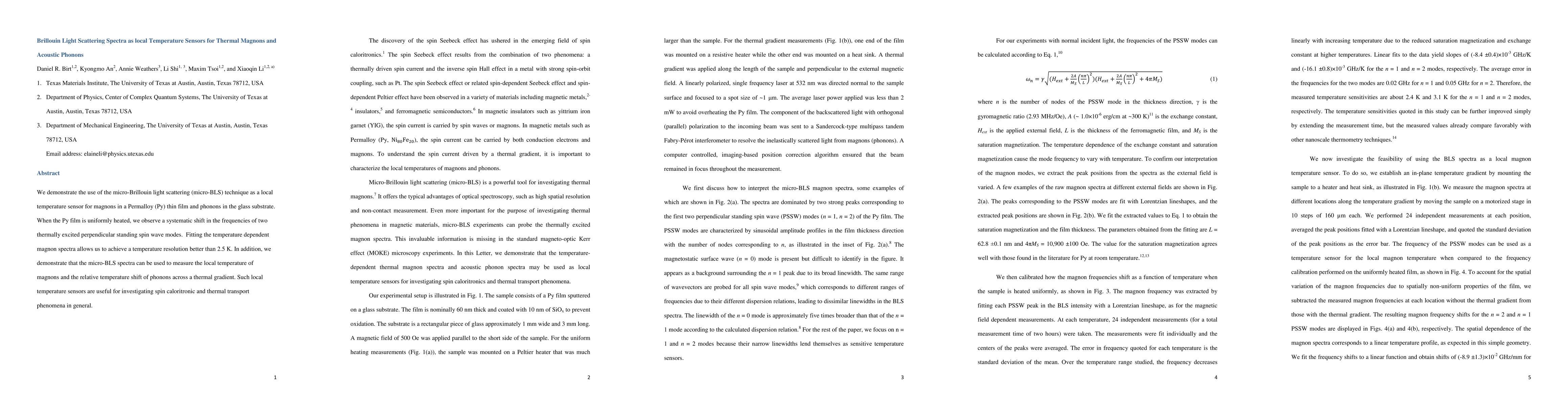 This paper uses micro-Brillouin light scattering (micro-BLS) to measure local temperatures of magnons in Permalloy and phonons in glass, achieving a resolution of better than 2.5 K. The technique reveals shifts in frequencies of thermally excited spin wave modes, providing insights into spin caloritronic and thermal transport phenomena.