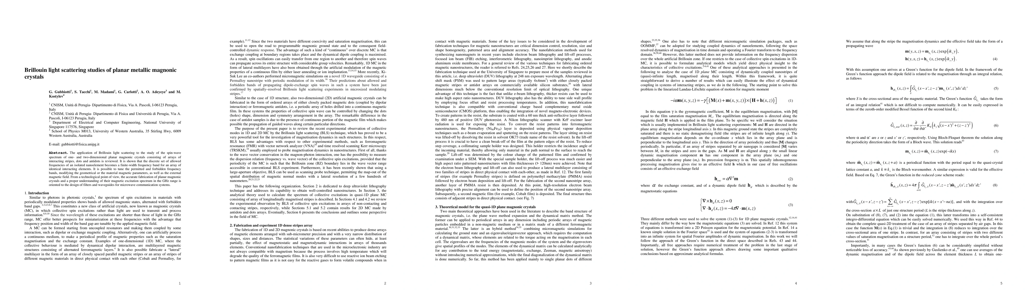 This paper reviews the use of Brillouin light scattering to study spin-wave spectra in planar metallic magnonic crystals, demonstrating how isolated nanoelements' discrete frequencies form a frequency band in arrays. The study highlights the tunability of these bands through geometric and magnetic modifications, with implications for designing microwave communication filters and waveguides.