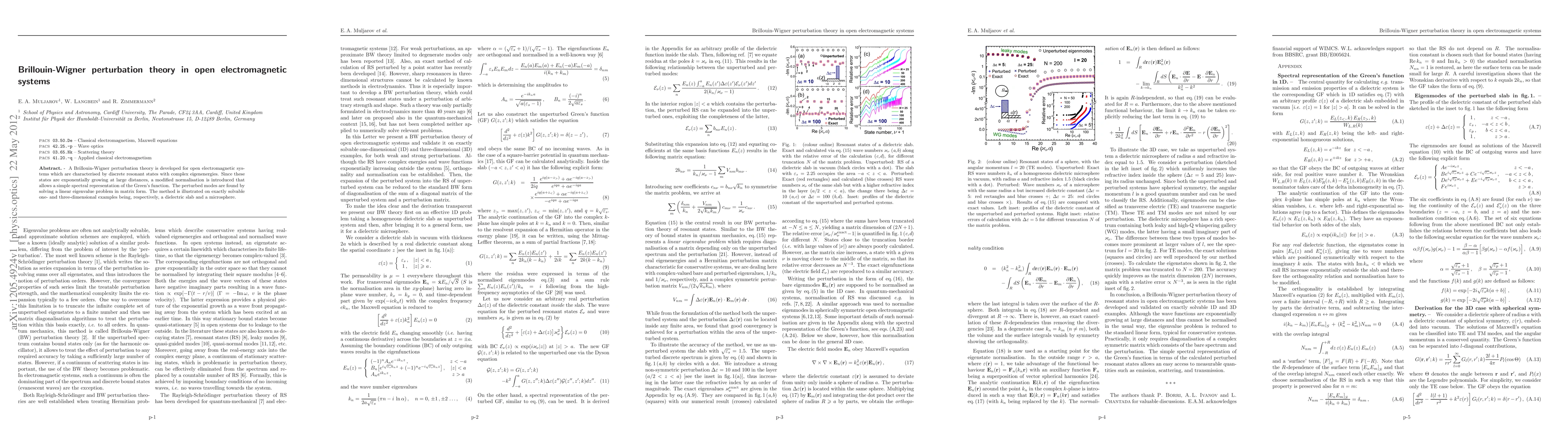 This paper develops Brillouin-Wigner perturbation theory for open electromagnetic systems with complex eigenenergies, introducing a modified normalization to represent the Green's function. The method is demonstrated through eigenvalue problems in dielectric slab and microsphere models.