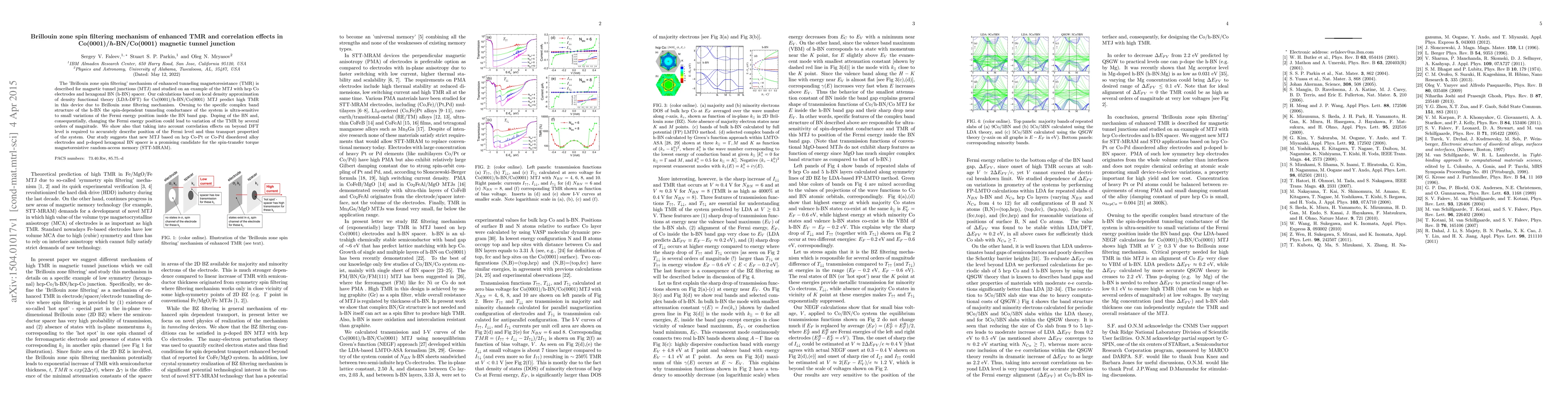 This paper investigates the 'Brillouin zone spin filtering' mechanism in Co(0001)/h-BN/Co(0001) magnetic tunnel junctions, predicting high tunneling magnetoresistance (TMR) due to spin-dependent tunneling conductance influenced by the Fermi energy position within the h-BN band gap. The study suggests that doping h-BN can significantly alter TMR, and correlation effects beyond DFT are essential for accurate Fermi level positioning and transport properties.