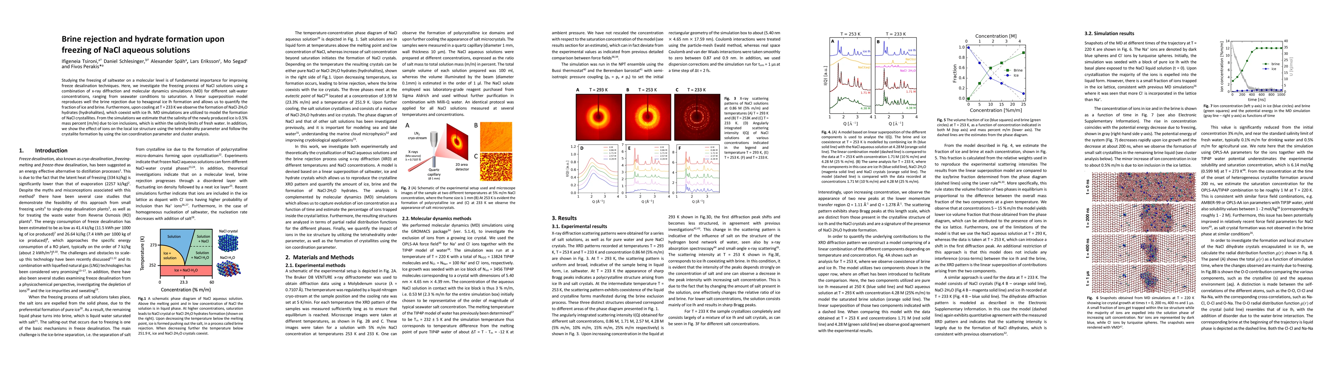 Studying the freezing of saltwater on a molecular level is of fundamental importance for improving freeze desalination techniques. Here, we investigate the freezing process of NaCl solutions using a combination of x-ray diffraction and molecular dynamics simulations (MD) for different salt-water concentrations, ranging from seawater conditions to saturation. A linear superposition model reproduces well the brine rejection due to hexagonal ice Ih formation and allows us to quantify the fraction of ice and brine. Furthermore, upon cooling at T = 233 K we observe the formation of NaCl$\cdot$2H$_2$O hydrates (hydrohalites), which coexist with ice Ih. MD simulations are utilized to model the formation of NaCl crystallites. From the simulations we estimate that the salinity of the newly produced ice is 0.5% mass percent (m/m) due to ion inclusions, which is within the salinity limits of fresh water. In addition, we show the effect of ions on the local ice structure using the tetrahedrality parameter and follow the crystalite formation by using the ion coordination parameter and cluster analysis.