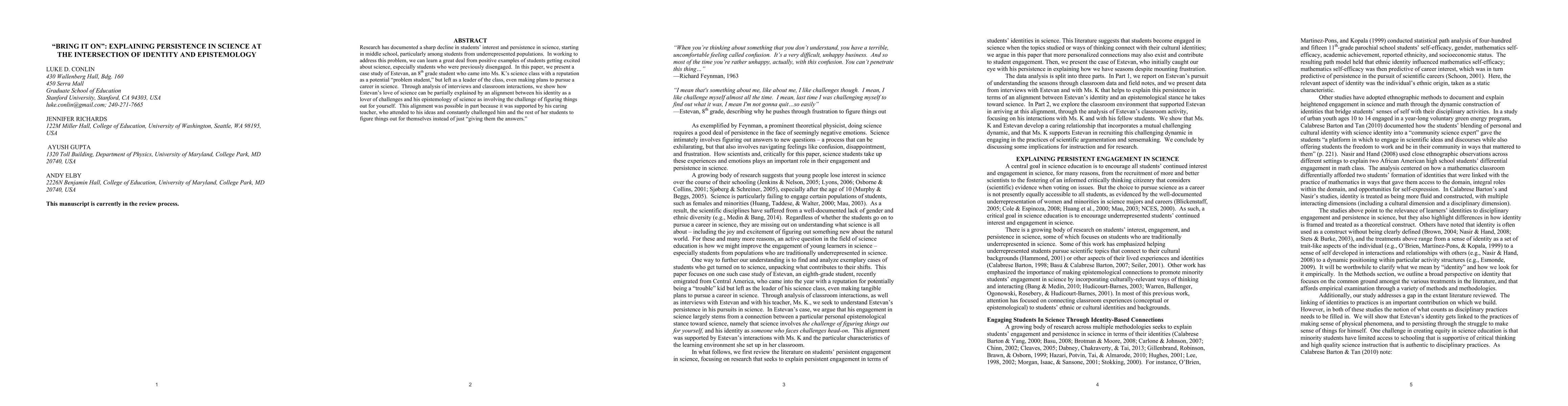 The paper presents a case study of Estevan, an 8th grade student who transformed from a 'problem student' to a science enthusiast under the guidance of teacher Ms. K. The study reveals that Estevan's newfound passion for science stemmed from his identity as a challenge-seeker aligning with his epistemology of science as self-discovery. Ms. K's supportive teaching approach, emphasizing independent thinking, significantly contributed to this transformation.