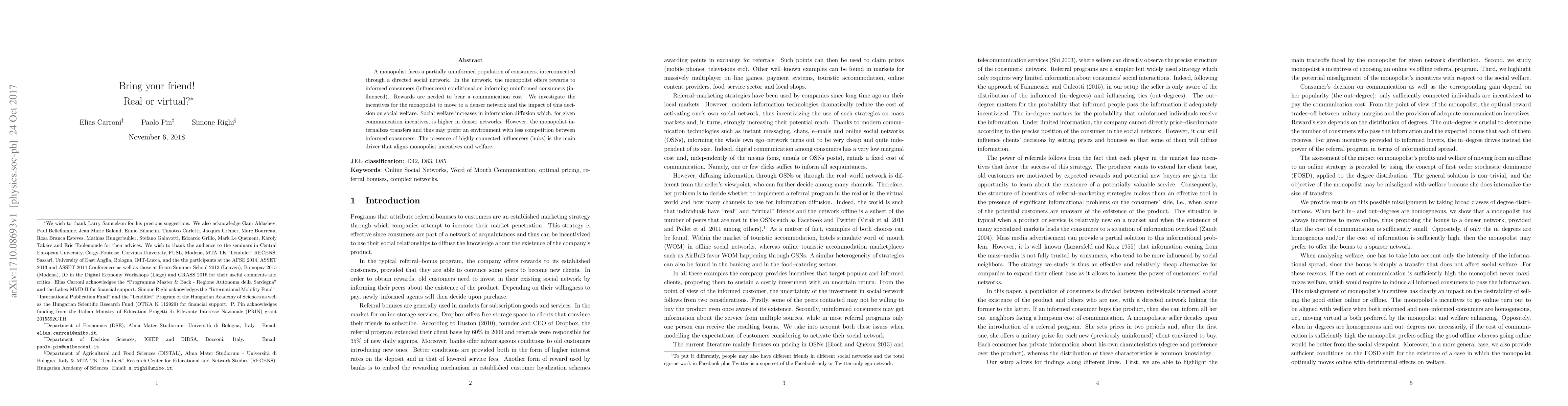 A monopolist faces a partially uninformed population of consumers, interconnected through a directed social network. In the network, the monopolist offers rewards to informed consumers (influencers) conditional on informing uninformed consumers (influenced). Rewards are needed to bear a communication cost. We investigate the incentives for the monopolist to move to a denser network and the impact of this decision on social welfare. Social welfare increases in information diffusion which, for given communication incentives, is higher in denser networks. However, the monopolist internalizes transfers and thus may prefer an environment with less competition between informed consumers. The presence of highly connected influencers (hubs) is the main driver that aligns monopolist incentives and welfare.