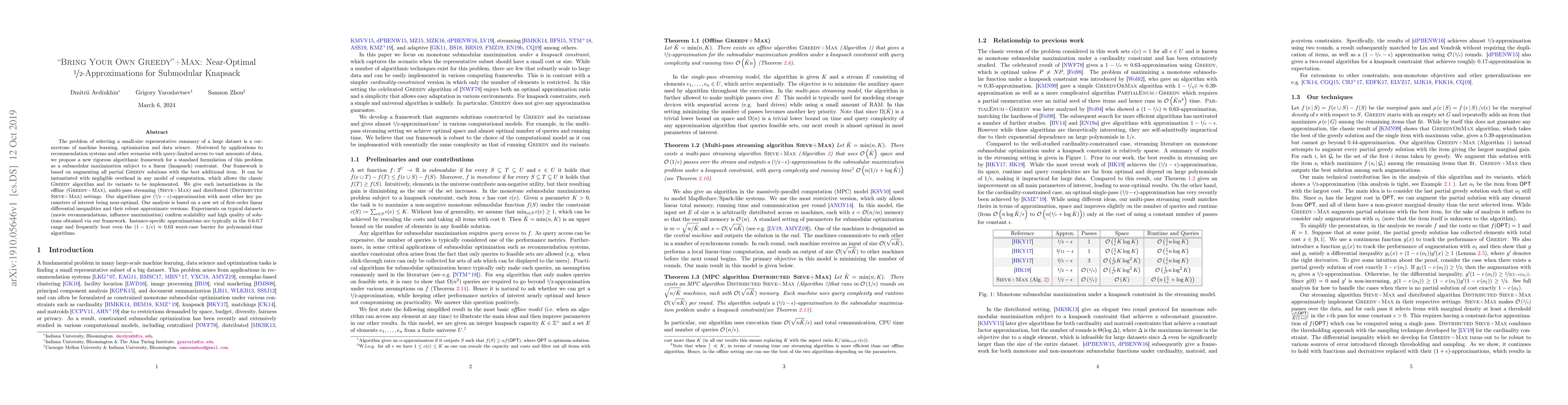 The problem of selecting a small-size representative summary of a large dataset is a cornerstone of machine learning, optimization and data science. Motivated by applications to recommendation systems and other scenarios with query-limited access to vast amounts of data, we propose a new rigorous algorithmic framework for a standard formulation of this problem as a submodular maximization subject to a linear (knapsack) constraint. Our framework is based on augmenting all partial Greedy solutions with the best additional item. It can be instantiated with negligible overhead in any model of computation, which allows the classic \greedy algorithm and its variants to be implemented. We give such instantiations in the offline (Greedy+Max), multi-pass streaming (Sieve+Max) and distributed (Distributed+Max) settings. Our algorithms give ($1/2-\epsilon$)-approximation with most other key parameters of interest being near-optimal. Our analysis is based on a new set of first-order linear differential inequalities and their robust approximate versions. Experiments on typical datasets (movie recommendations, influence maximization) confirm scalability and high quality of solutions obtained via our framework. Instance-specific approximations are typically in the 0.6-0.7 range and frequently beat even the $(1-1/e) \approx 0.63$ worst-case barrier for polynomial-time algorithms.