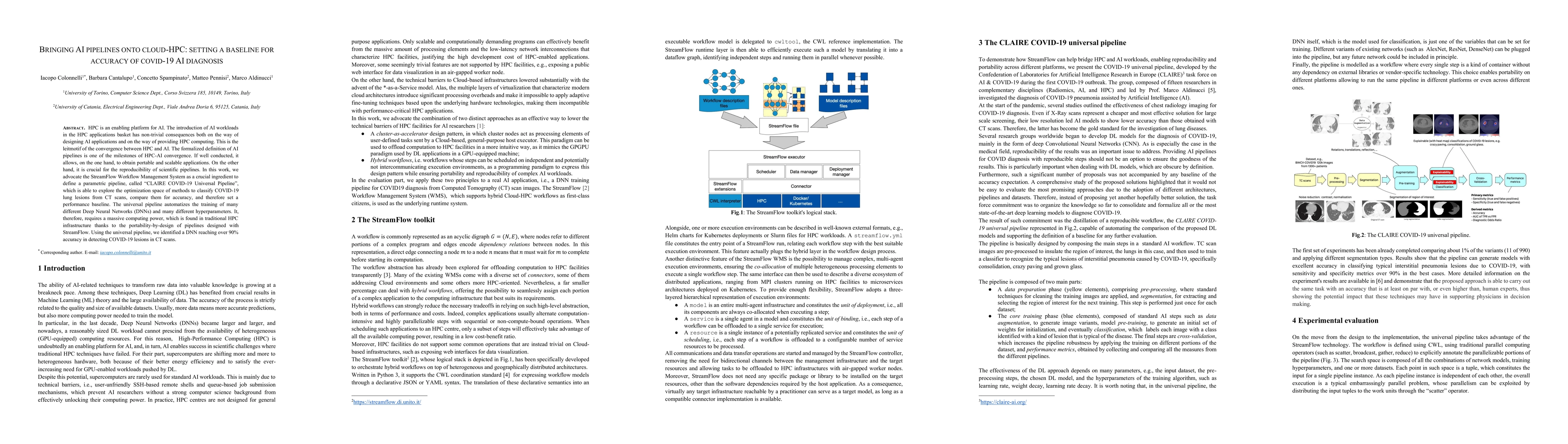 The paper presents a parametric AI pipeline, 'CLAIRE COVID-19 Universal Pipeline,' developed using StreamFlow Workflow Management System. This pipeline automates the training of various Deep Neural Networks (DNNs) and hyperparameters to classify COVID-19 lung lesions from CT scans. It identifies a DNN achieving over 90% accuracy, demonstrating the potential of HPC infrastructure in handling massive AI computational tasks and setting a performance baseline for COVID-19 diagnosis.