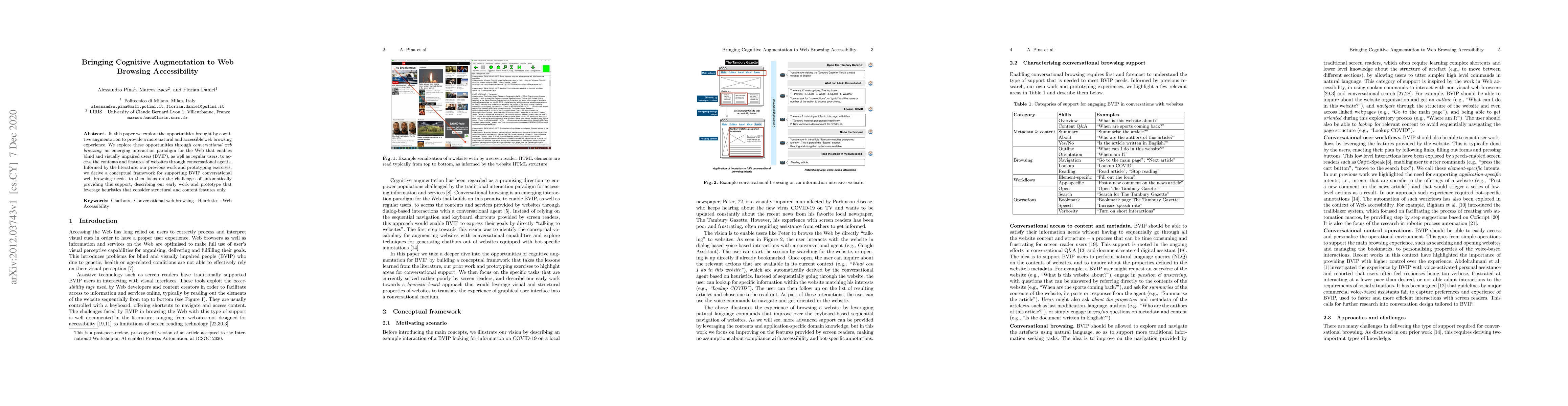 This paper investigates the potential of cognitive augmentation to enhance web browsing accessibility through conversational web browsing, aiming to support blind and visually impaired users (BVIP) and regular users. The authors propose a conceptual framework for addressing BVIP needs and present an early prototype leveraging heuristics based on structural and content features.