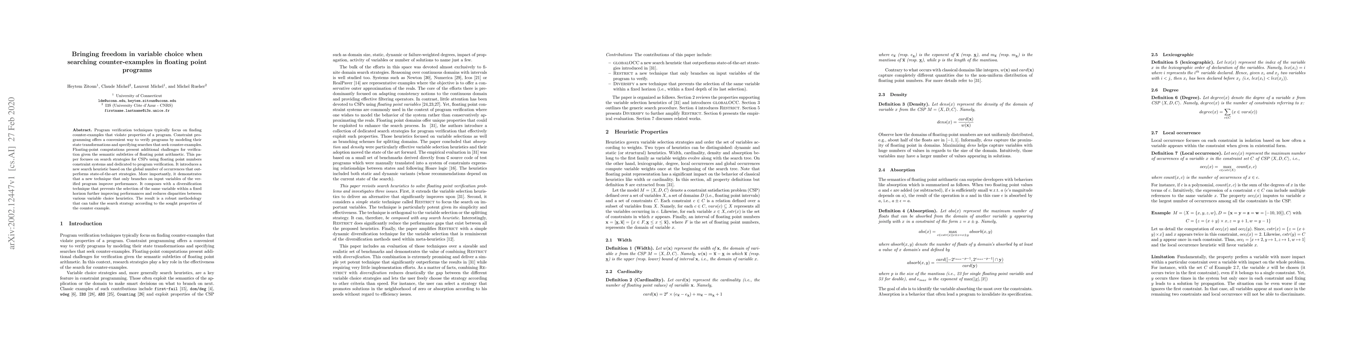 A new search heuristic for verifying floating-point programs improves performance by focusing on global occurrences of counter-examples, with a technique that only branches on input variables.