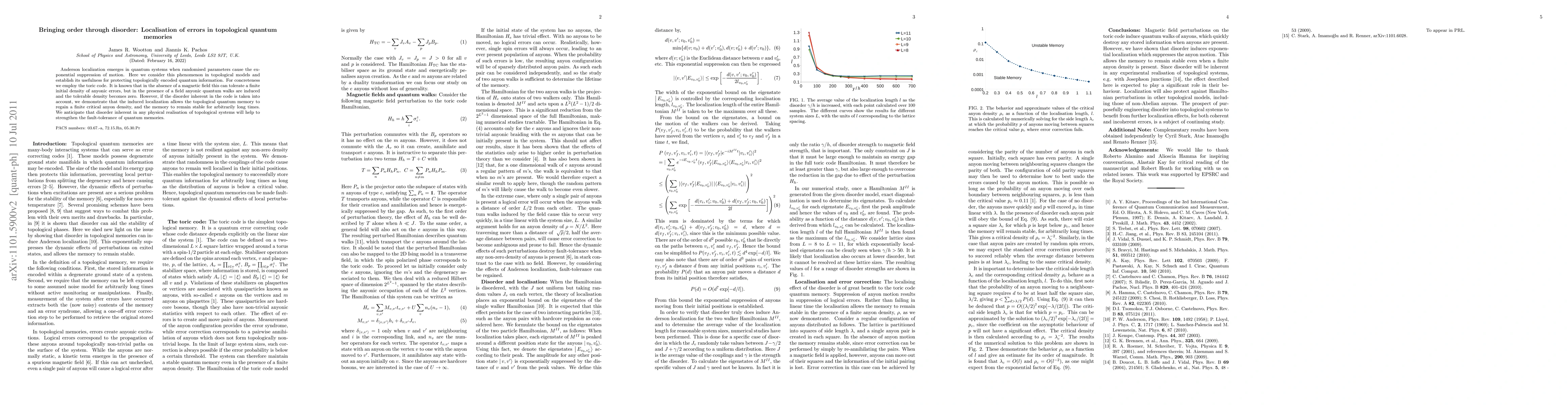 Anderson localization emerges in quantum systems when randomised parameters cause the exponential suppression of motion. Here we consider this phenomenon in topological models and establish its usefulness for protecting topologically encoded quantum information. For concreteness we employ the toric code. It is known that in the absence of a magnetic field this can tolerate a finite initial density of anyonic errors, but in the presence of a field anyonic quantum walks are induced and the tolerable density becomes zero. However, if the disorder inherent in the code is taken into account, we demonstrate that the induced localization allows the topological quantum memory to regain a finite critical anyon density, and the memory to remain stable for arbitrarily long times. We anticipate that disorder inherent in any physical realisation of topological systems will help to strengthen the fault-tolerance of quantum memories.