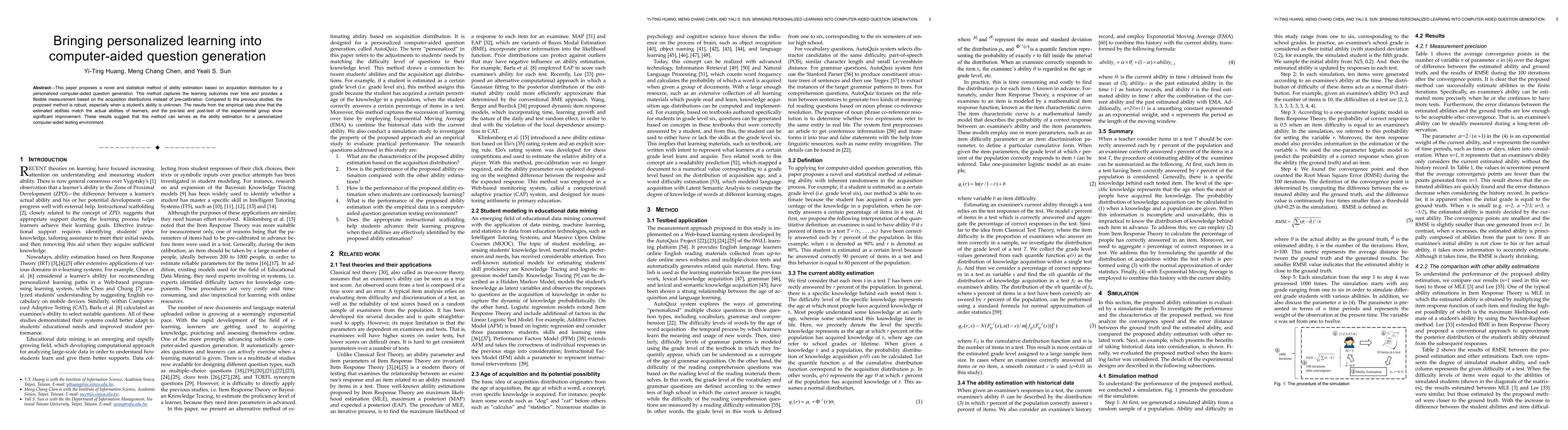 This paper proposes a new method for estimating student abilities in personalized computer-aided question generation, with results showing improved learning outcomes and robust ability estimation. The approach uses acquisition distribution to capture learning outcomes over time, providing a flexible measurement without precalibration.