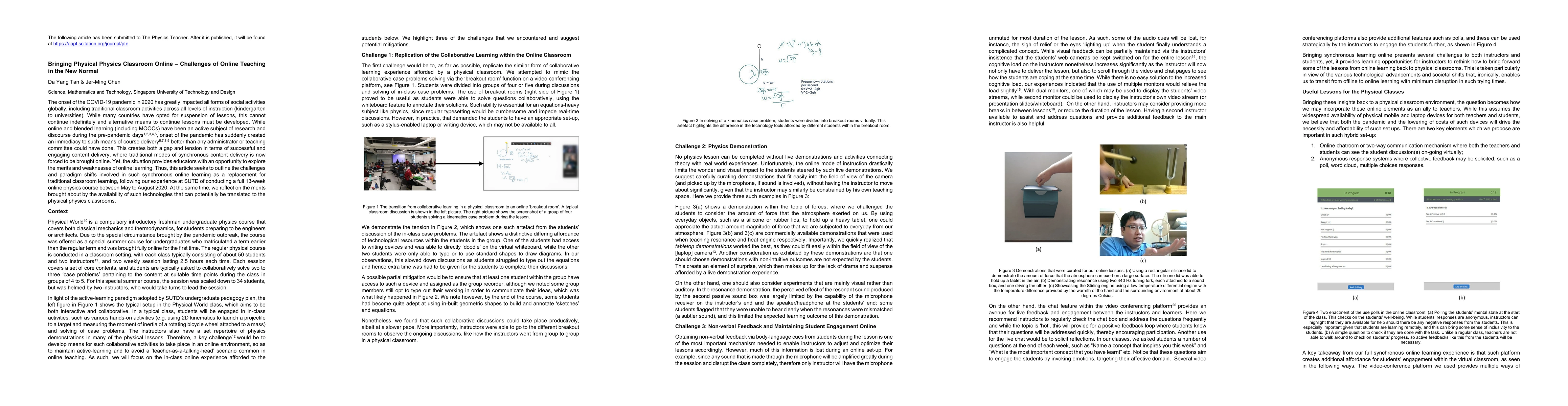 The onset of the COVID-19 pandemic in 2020 has greatly impacted all forms of social activities globally, including traditional classroom activities across all levels of instruction (kindergarten to universities). While many countries have opted for suspension of lessons, this cannot continue indefinitely and alternative means to continue lessons must be developed. While online and blended learning (including MOOCs) have been an active subject of research and discourse during the pre-pandemic days, onset of the pandemic has suddenly created an immediacy to such means of course delivery, better than any administrator or teaching committee could have done. This creates both a gap and tension in terms of successful and engaging content delivery, where traditional modes of synchronous content delivery is now forced to be brought online. Yet, the situation provides educators with an opportunity to explore the merits and weaknesses of online learning. Thus, this article seeks to outline the challenges and paradigm shifts involved in such synchronous online learning as a replacement for traditional classroom learning, following our experience at SUTD of conducting a full 13-week online physics course between May to August 2020. At the same time, we reflect on the merits brought about by the availability of such technologies that can potentially be translated to the physical physics classrooms.