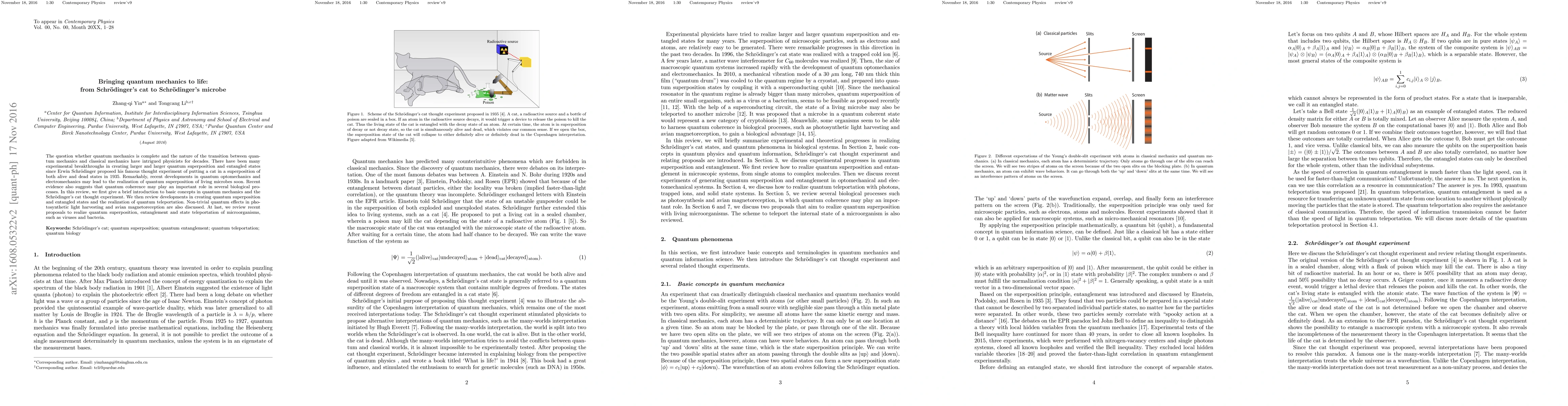 The question whether quantum mechanics is complete and the nature of the transition between quantum mechanics and classical mechanics have intrigued physicists for decades. There have been many experimental breakthroughs in creating larger and larger quantum superposition and entangled states since Erwin Schr\"odinger proposed his famous thought experiment of putting a cat in a superposition of both alive and dead states in 1935. Remarkably, recent developments in quantum optomechanics and electromechanics may lead to the realization of quantum superposition of living microbes soon. Recent evidence also suggests that quantum coherence may play an important role in several biological processes. In this review, we first give a brief introduction to basic concepts in quantum mechanics and the Schr\"odinger's cat thought experiment. We then review developments in creating quantum superposition and entangled states and the realization of quantum teleportation. Non-trivial quantum effects in photosynthetic light harvesting and avian magnetoreception are also discussed. At last, we review recent proposals to realize quantum superposition, entanglement and state teleportation of microorganisms, such as viruses and bacteria.