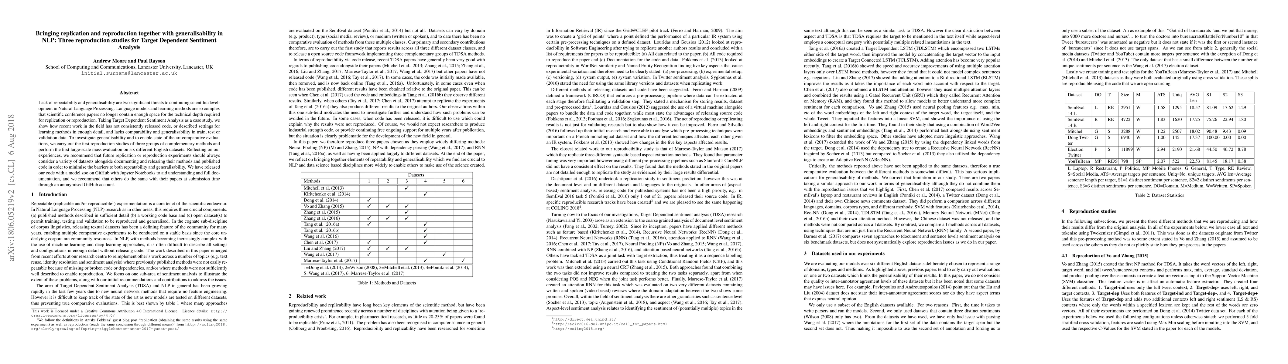 Lack of repeatability and generalisability are two significant threats to continuing scientific development in Natural Language Processing. Language models and learning methods are so complex that scientific conference papers no longer contain enough space for the technical depth required for replication or reproduction. Taking Target Dependent Sentiment Analysis as a case study, we show how recent work in the field has not consistently released code, or described settings for learning methods in enough detail, and lacks comparability and generalisability in train, test or validation data. To investigate generalisability and to enable state of the art comparative evaluations, we carry out the first reproduction studies of three groups of complementary methods and perform the first large-scale mass evaluation on six different English datasets. Reflecting on our experiences, we recommend that future replication or reproduction experiments should always consider a variety of datasets alongside documenting and releasing their methods and published code in order to minimise the barriers to both repeatability and generalisability. We have released our code with a model zoo on GitHub with Jupyter Notebooks to aid understanding and full documentation, and we recommend that others do the same with their papers at submission time through an anonymised GitHub account.