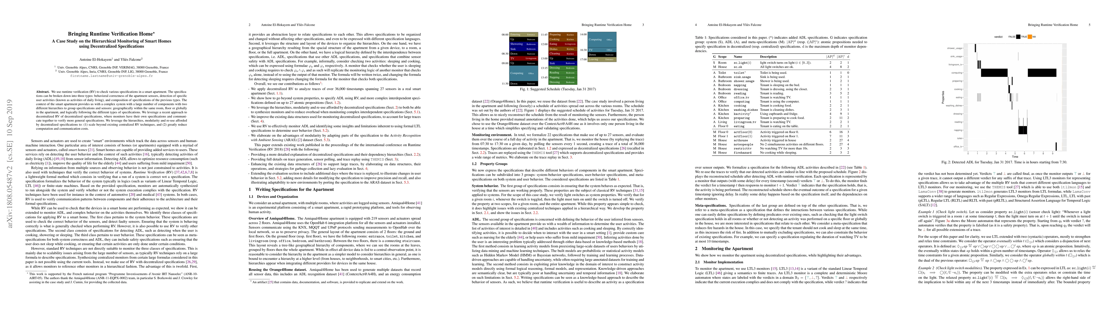 We use runtime verification (RV) to check various specifications in a smart apartment. The specifications can be broken down into three types: behavioral correctness of the apartment sensors, detection of specific user activities (known as activities of daily living), and composition of specifications of the previous types. The context of the smart apartment provides us with a complex system with a large number of components with two different hierarchies to group specifications and sensors: geographically within the same room, floor or globally in the apartment, and logically following the different types of specifications. We leverage a recent approach to decentralized RV of decentralized specifications, where monitors have their own specifications and communicate together to verify more general specifications. We leverage the hierarchies, modularity and re-use afforded by decentralized specifications to: (1) scale beyond existing centralized RV techniques, and (2) greatly reduce computation and communication costs.