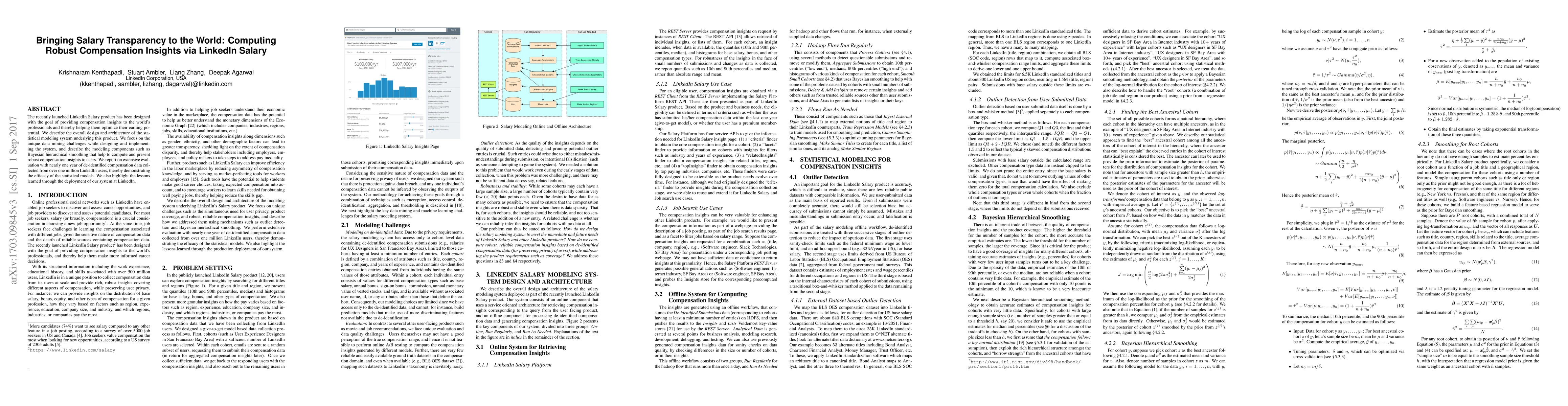 This paper details the design and architecture of LinkedIn's Salary product, which uses statistical modeling, including Bayesian hierarchical smoothing, to provide robust compensation insights. The system was evaluated using a year's worth of data from over a million users, demonstrating its effectiveness and highlighting deployment lessons.