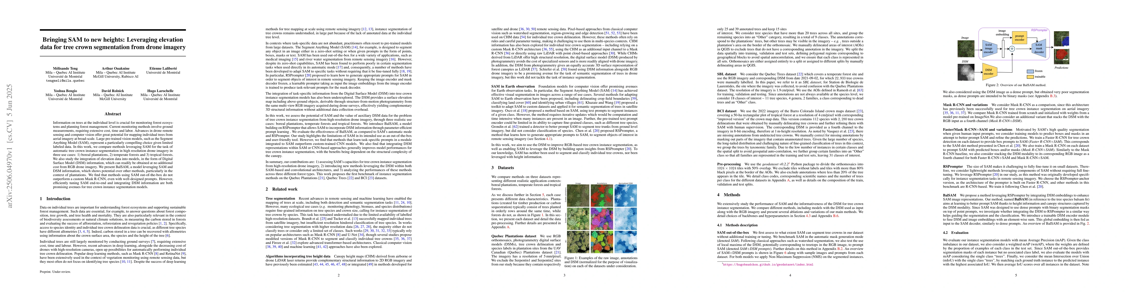 This work distinguishes itself by combining pre-trained vision models like SAM with readily available elevation data (DSM) for enhanced tree crown segmentation in drone imagery, offering a promising approach for large-scale forest monitoring.