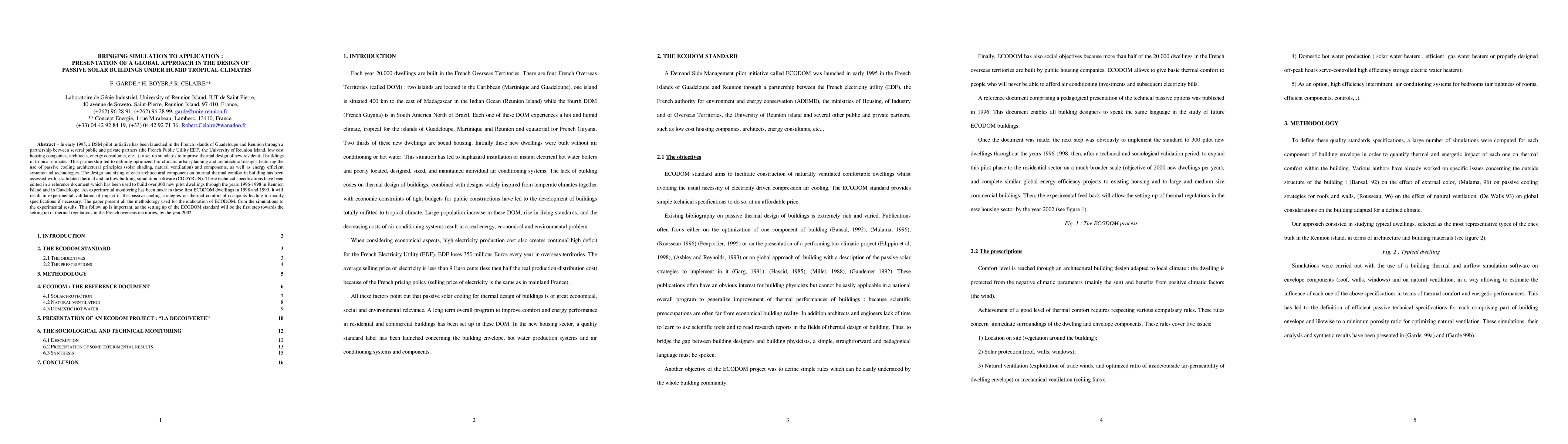 In early 1995, a DSM pilot initiative has been launched in the French islands of Guadeloupe and Reunion through a partnership between several public and private partners (the French Public Utility EDF, the University of Reunion Island, low cost housing companies, architects, energy consultants, etc...) to set up standards to improve thermal design of new residential buildings in tropical climates. This partnership led to defining optimized bio-climatic urban planning and architectural designs featuring the use of passive cooling architectural principles (solar shading, natural ventilation) and components, as well as energy efficient systems and technologies. The design and sizing of each architectural component on internal thermal comfort in building has been assessed with a validated thermal and airflow building simulation software (CODYRUN). These technical specifications have been edited in a reference document which has been used to build over 300 new pilot dwellings through the years 1996-1998 in Reunion Island and in Guadeloupe. An experimental monitoring has been made in these first ECODOM dwellings in 1998 and 1999. It will result in experimental validation of impact of the passive cooling strategies on thermal comfort of occupants leading to modify specifications if necessary. The paper present all the methodology used for the elaboration of ECODOM, from the simulations to the experimental results. This follow up is important, as the setting up of the ECODOM standard will be the first step towards the setting up of thermal regulations in the French overseas territories, by the year 2002.