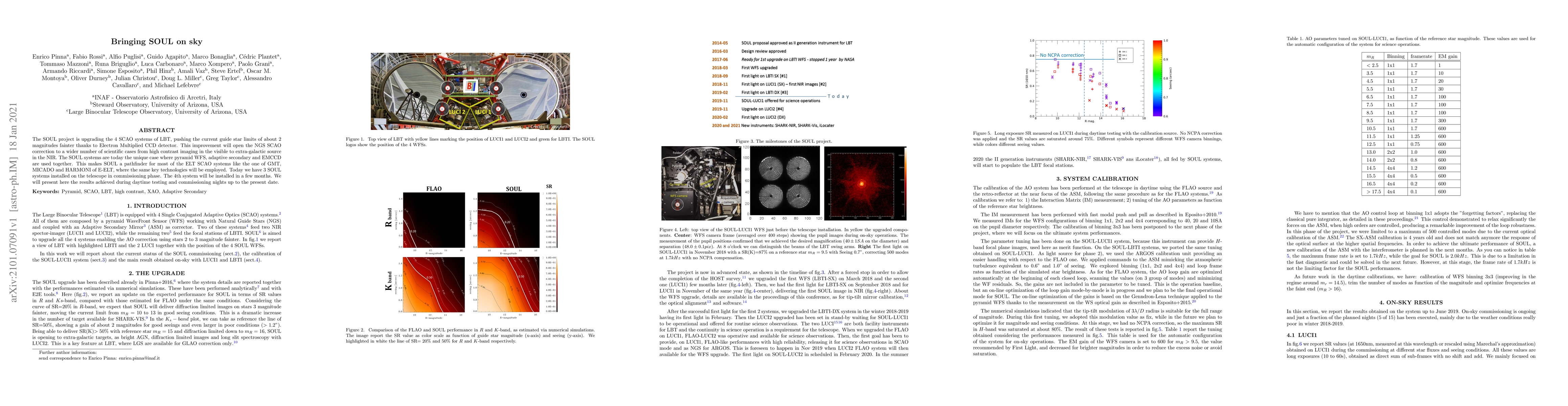 The SOUL project is upgrading the 4 SCAO systems of LBT, pushing the current guide star limits of about 2 magnitudes fainter thanks to Electron Multiplied CCD detector. This improvement will open the NGS SCAO correction to a wider number of scientific cases from high contrast imaging in the visible to extra-galactic source in the NIR. The SOUL systems are today the unique case where pyramid WFS, adaptive secondary and EMCCD are used together. This makes SOUL a pathfinder for most of the ELT SCAO systems like the one of GMT, MICADO and HARMONI of E-ELT, where the same key technologies will be employed. Today we have 3 SOUL systems installed on the telescope in commissioning phase. The 4th system will be installed in a few months. We will present here the results achieved during daytime testing and commissioning nights up to the present date.
