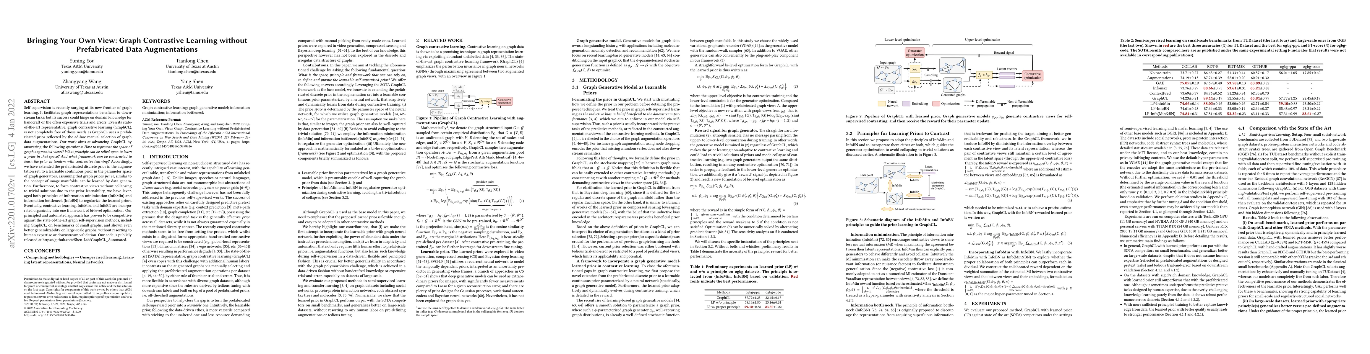 Self-supervision is recently surging at its new frontier of graph learning. It facilitates graph representations beneficial to downstream tasks; but its success could hinge on domain knowledge for handcraft or the often expensive trials and errors. Even its state-of-the-art representative, graph contrastive learning (GraphCL), is not completely free of those needs as GraphCL uses a prefabricated prior reflected by the ad-hoc manual selection of graph data augmentations. Our work aims at advancing GraphCL by answering the following questions: How to represent the space of graph augmented views? What principle can be relied upon to learn a prior in that space? And what framework can be constructed to learn the prior in tandem with contrastive learning? Accordingly, we have extended the prefabricated discrete prior in the augmentation set, to a learnable continuous prior in the parameter space of graph generators, assuming that graph priors per se, similar to the concept of image manifolds, can be learned by data generation. Furthermore, to form contrastive views without collapsing to trivial solutions due to the prior learnability, we have leveraged both principles of information minimization (InfoMin) and information bottleneck (InfoBN) to regularize the learned priors. Eventually, contrastive learning, InfoMin, and InfoBN are incorporated organically into one framework of bi-level optimization. Our principled and automated approach has proven to be competitive against the state-of-the-art graph self-supervision methods, including GraphCL, on benchmarks of small graphs; and shown even better generalizability on large-scale graphs, without resorting to human expertise or downstream validation. Our code is publicly released at https://github.com/Shen-Lab/GraphCL_Automated.