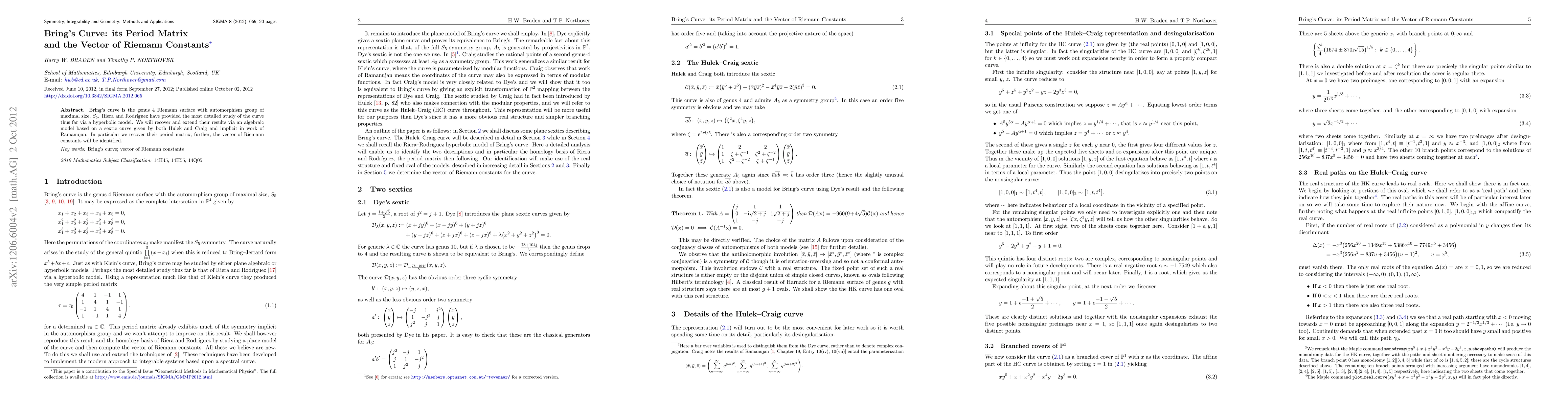 Bring's curve is the genus 4 Riemann surface with automorphism group of maximal size, $S_5$. Riera and Rodr\'iguez have provided the most detailed study of the curve thus far via a hyperbolic model. We will recover and extend their results via an algebraic model based on a sextic curve given by both Hulek and Craig and implicit in work of Ramanujan. In particular we recover their period matrix; further, the vector of Riemann constants will be identified.