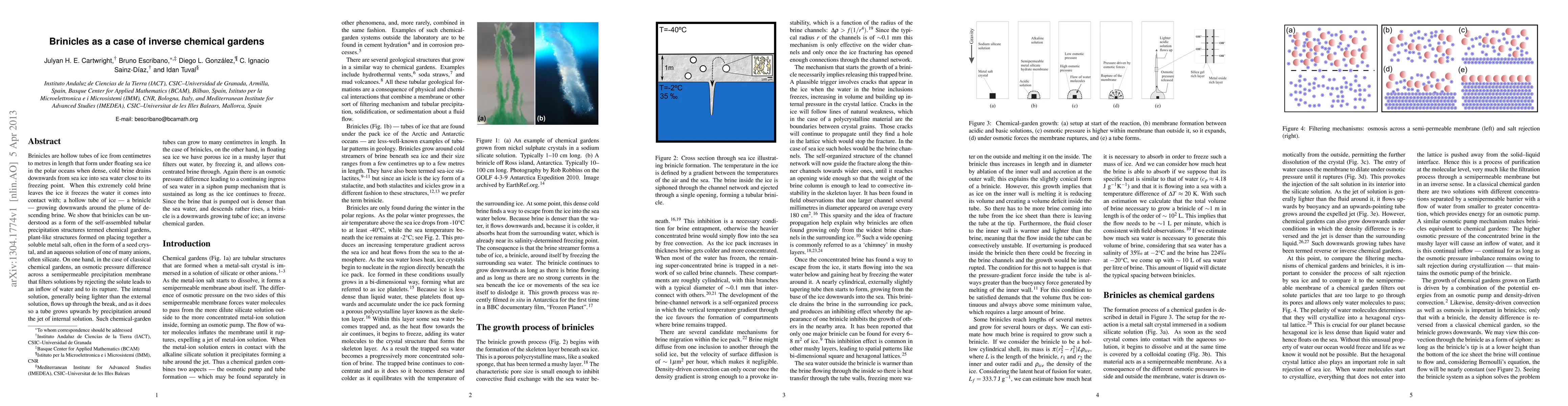 Brinicles, hollow ice tubes forming under polar sea ice, are explained as an inverse form of chemical gardens where dense brine drains downwards, freezing surrounding water and creating a downward-growing ice structure. This process is driven by an osmotic pressure difference, similar to the formation of traditional chemical gardens but with brine descending instead of rising.