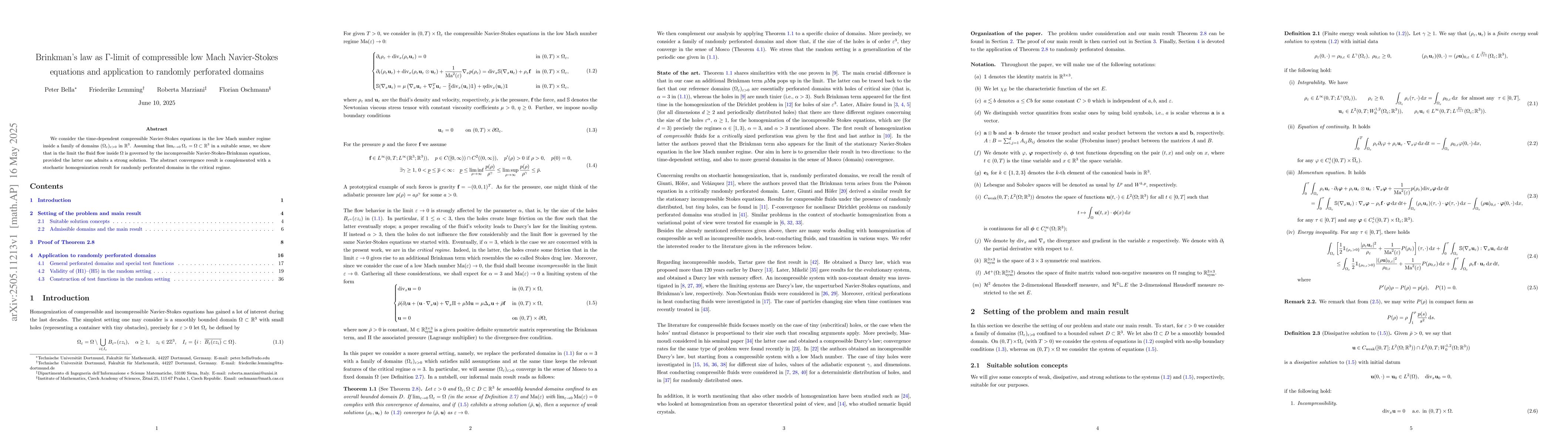 Researchers show that in a limit case, fluid flow in a domain governed by compressible Navier-Stokes equations becomes governed by incompressible Navier-Stokes-Brinkman equations for randomly perforated domains.
