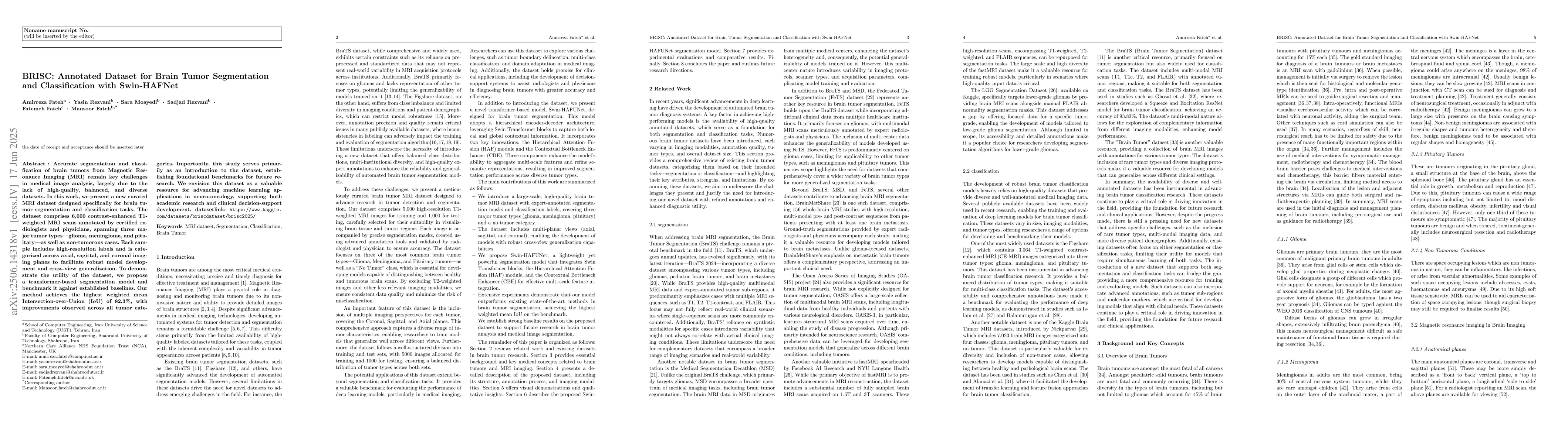 Accurate segmentation and classification of brain tumors from Magnetic Resonance Imaging (MRI) remain key challenges in medical image analysis, largely due to the lack of high-quality, balanced, and diverse datasets. In this work, we present a new curated MRI dataset designed specifically for brain tumor segmentation and classification tasks. The dataset comprises 6,000 contrast-enhanced T1-weighted MRI scans annotated by certified radiologists and physicians, spanning three major tumor types-glioma, meningioma, and pituitary-as well as non-tumorous cases. Each sample includes high-resolution labels and is categorized across axial, sagittal, and coronal imaging planes to facilitate robust model development and cross-view generalization. To demonstrate the utility of the dataset, we propose a transformer-based segmentation model and benchmark it against established baselines. Our method achieves the highest weighted mean Intersection-over-Union (IoU) of 82.3%, with improvements observed across all tumor categories. Importantly, this study serves primarily as an introduction to the dataset, establishing foundational benchmarks for future research. We envision this dataset as a valuable resource for advancing machine learning applications in neuro-oncology, supporting both academic research and clinical decision-support development. datasetlink: https://www.kaggle.com/datasets/briscdataset/brisc2025/