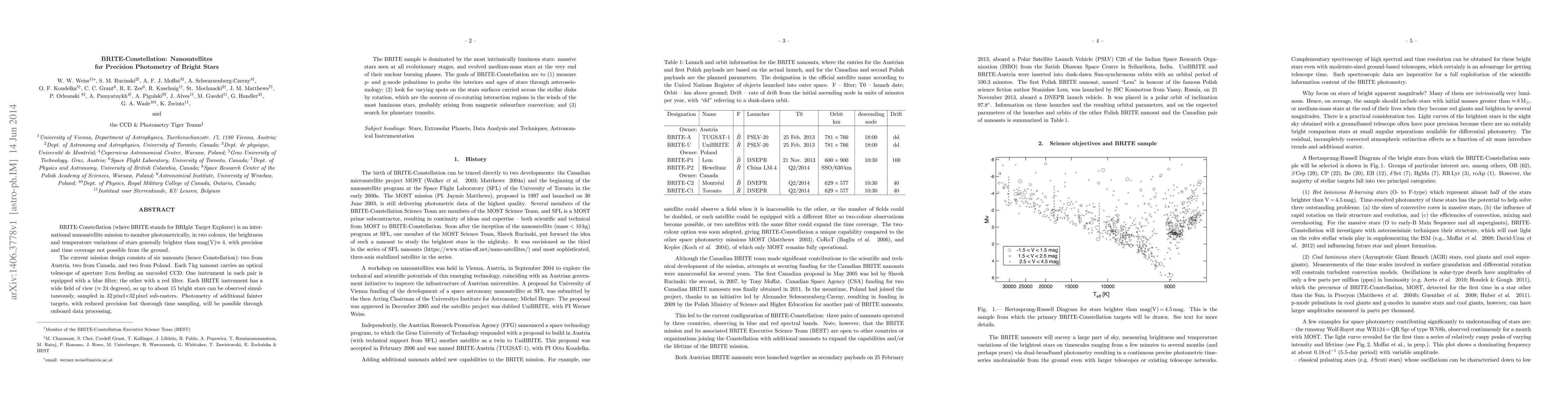 The BRITE-Constellation mission deploys six nanosatellites to precisely monitor the brightness and temperature variations of bright stars using two-color photometry. The goal is to achieve unprecedented precision and temporal coverage, focusing on massive and evolved medium-class stars to study pulsations, surface spots, and potential planetary transits.