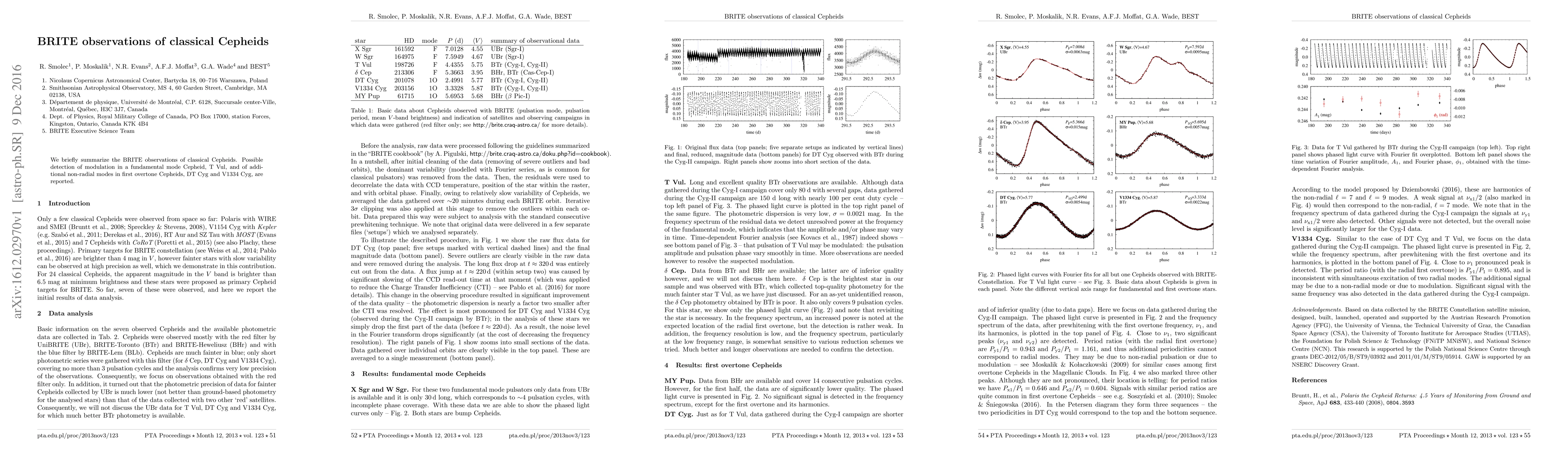 We briefly summarize the BRITE observations of classical Cepheids. Possible detection of modulation in a fundamental mode Cepheid, T Vul, and of additional non-radial modes in first overtone Cepheids, DT Cyg and V1334 Cyg, are reported.