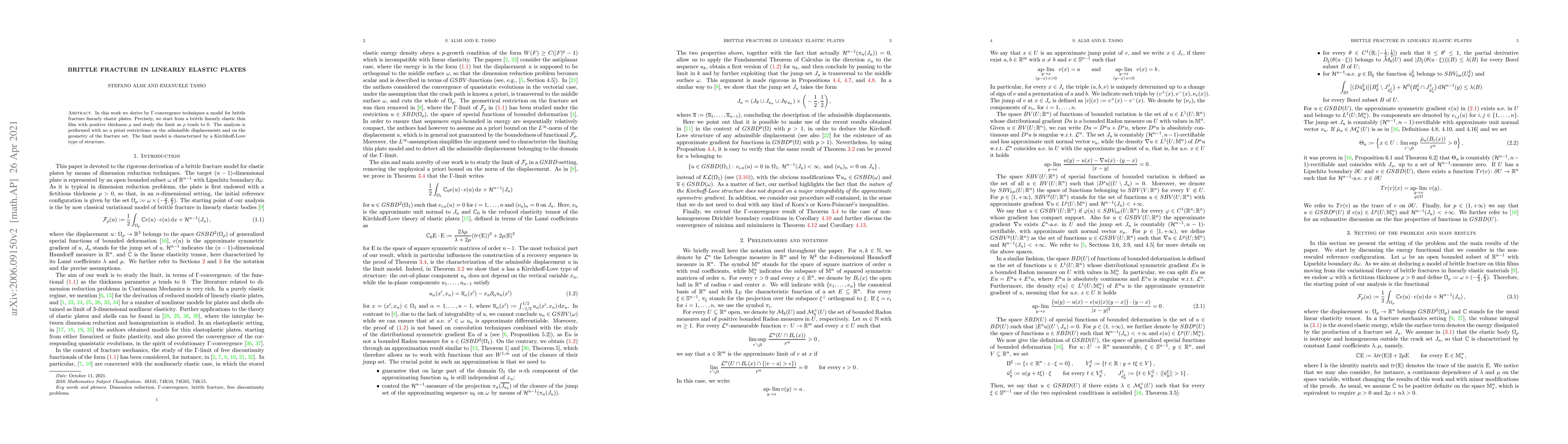 This paper develops a brittle fracture model for linearly elastic plates using Gamma-convergence techniques, deriving a limit model characterized by a Kirchhoff-Love structure as the plate thickness approaches zero. The analysis considers all admissible displacements and fracture geometries without prior restrictions.