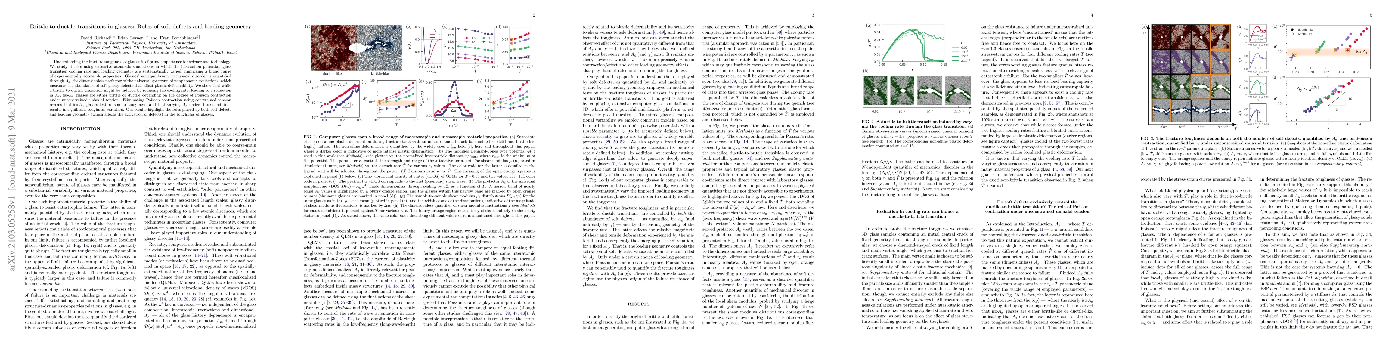 This paper uses atomistic simulations to investigate how varying cooling rates and loading geometry affect the fracture toughness of glasses. It finds that while cooling rate influences the abundance of soft defects, the geometry of loading determines whether the glass transitions from brittle to ductile, highlighting the importance of both soft defects and loading conditions in toughness.