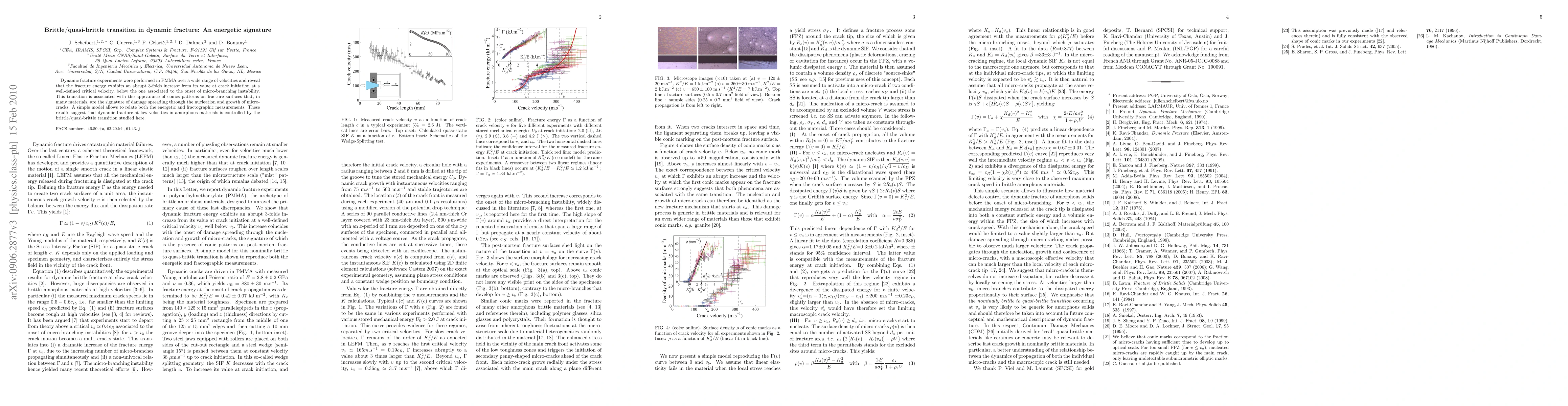 Dynamic fracture experiments in PMMA show a 3-fold increase in fracture energy at a critical velocity, marking a brittle/quasi-brittle transition. This transition is characterized by the emergence of conic patterns on fracture surfaces, indicating damage spreading via microcrack nucleation and growth.