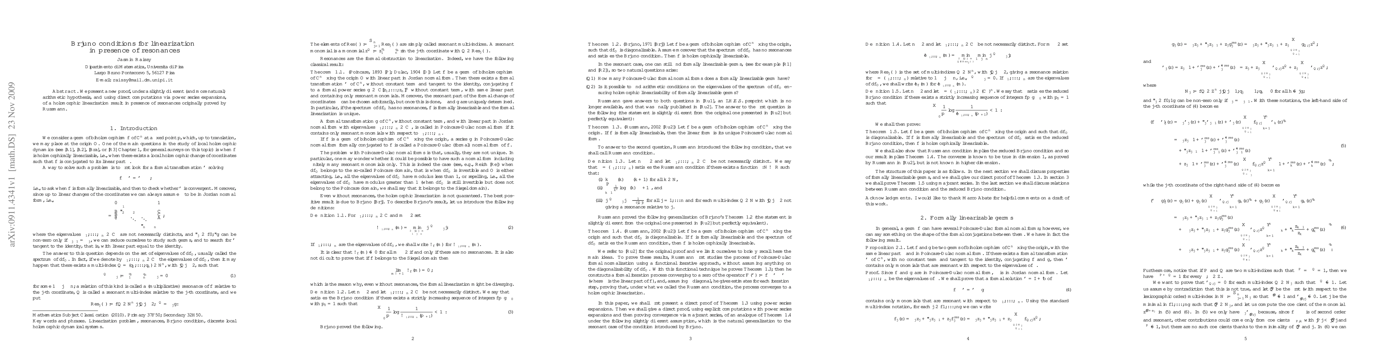 We present a new proof, under a slightly different (and more natural) arithmetic hypothesis, and using direct computations via power series expansions, of a holomorphic linearization result in presence of resonances originally proved by R\"ussmann.