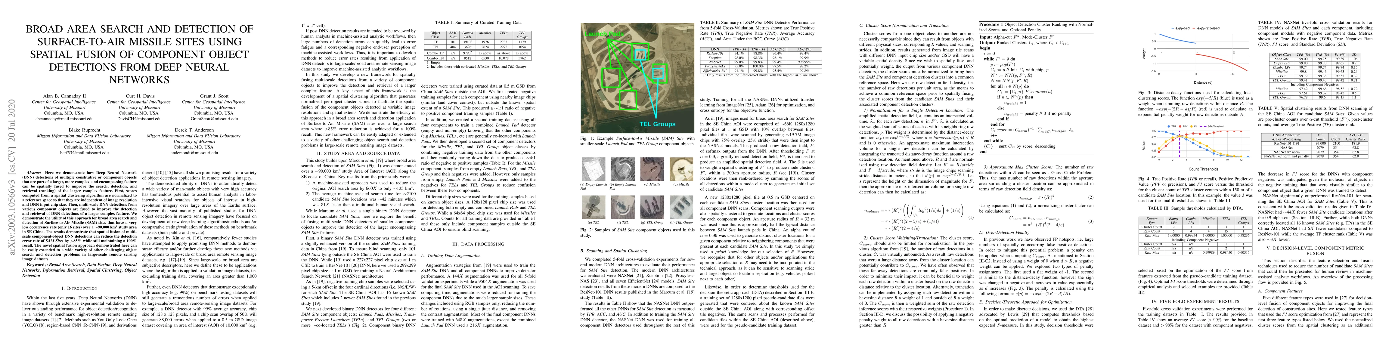 Here we demonstrate how Deep Neural Network (DNN) detections of multiple constitutive or component objects that are part of a larger, more complex, and encompassing feature can be spatially fused to improve the search, detection, and retrieval (ranking) of the larger complex feature. First, scores computed from a spatial clustering algorithm are normalized to a reference space so that they are independent of image resolution and DNN input chip size. Then, multi-scale DNN detections from various component objects are fused to improve the detection and retrieval of DNN detections of a larger complex feature. We demonstrate the utility of this approach for broad area search and detection of Surface-to-Air Missile (SAM) sites that have a very low occurrence rate (only 16 sites) over a ~90,000 km^2 study area in SE China. The results demonstrate that spatial fusion of multi-scale component-object DNN detections can reduce the detection error rate of SAM Sites by $>$85% while still maintaining a 100% recall. The novel spatial fusion approach demonstrated here can be easily extended to a wide variety of other challenging object search and detection problems in large-scale remote sensing image datasets.