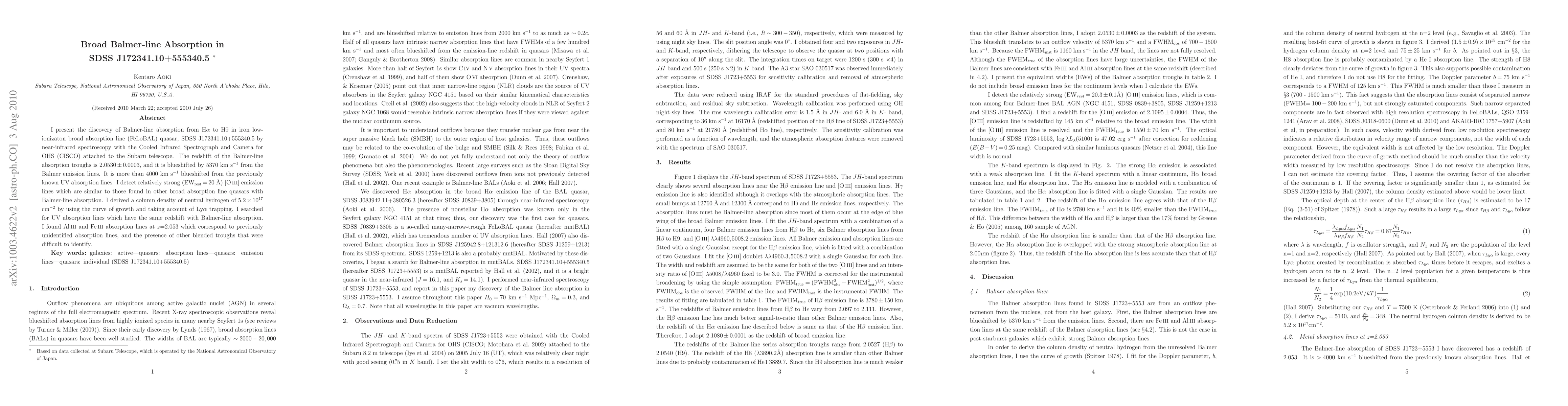 The paper reports the discovery of Balmer-line absorption from H alpha to H9 in the iron low-ionization broad absorption line (FeLoBAL) quasar SDSS J172341.10+555340.5, revealing a blueshifted absorption trough at a redshift of 2.0530 +/- 0.0003. The study also identifies new UV absorption lines of Al II and Fe III at the same redshift.