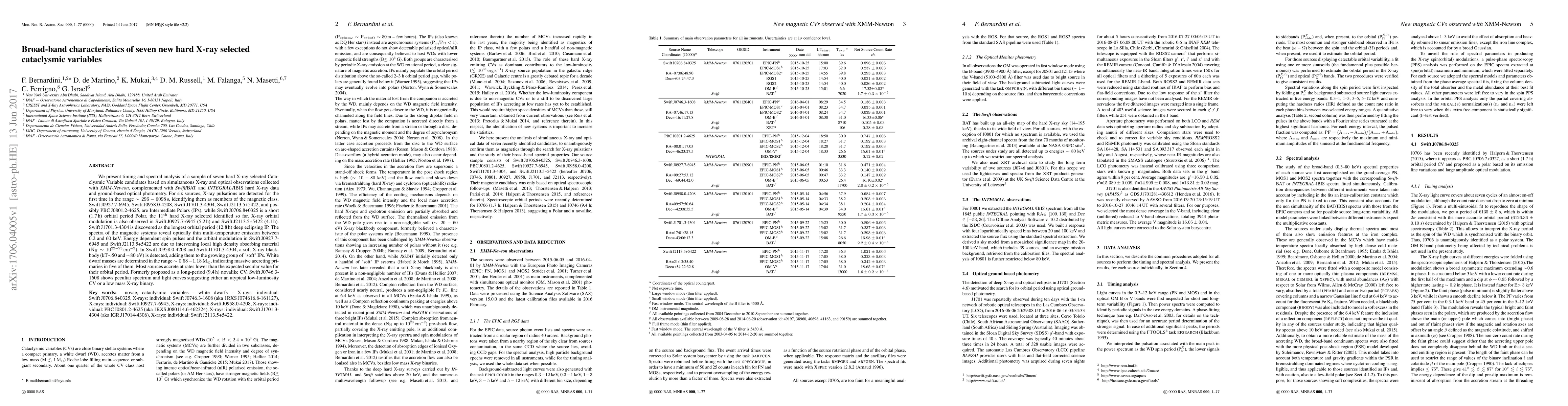 We present timing and spectral analysis of a sample of seven hard X-ray selected Cataclysmic Variable candidates based on simultaneous X-ray and optical observations collected with XMM-Newton , complemented with Swift/BAT and INTEGRAL/IBIS hard X-ray data and ground-based optical photometry. For six sources, X-ray pulsations are detected for the first time in the range $\rm \sim296-6098\,s$, identifying them as members of the magnetic class. Swift J0927.7-6945, Swift J0958.0-4208, Swift J1701.3-4304, Swift J2113.5+5422, and possibly PBC J0801.2-4625, are Intermediate Polars (IPs), while Swift J0706.8+0325 is a short (1.7 h) orbital period Polar, the 11$^{\rm th}$ hard X-ray selected identified so far. X-ray orbital modulation is also observed in Swift J0927.7-6945 (5.2 h) and Swift J2113.5+5422 (4.1 h). Swift J1701.3-4304 is discovered as the longest orbital period (12.8 h) deep eclipsing IP. The spectra of the magnetic systems reveal optically thin multi-temperature emission between 0.2 and 60 keV. Energy dependent spin pulses and the orbital modulation in Swift J0927.7-6945 and Swift J2113.5+5422 are due to intervening local high density absorbing material ($\rm N_H\sim10^{22-23}\,cm^{-2}$). In Swift J0958.0-4208 and Swift J1701.3-4304, a soft X-ray blackbody (kT$\sim$50 and $\sim$80 eV) is detected, adding them to the growing group of "soft" IPs. White dwarf masses are determined in the range $\rm \sim0.58-1.18\,M_{\odot}$, indicating massive accreting primaries in five of them. Most sources accrete at rates lower than the expected secular value for their orbital period. Formerly proposed as a long-period (9.4 h) novalike CV, Swift J0746.3-1608 shows peculiar spectrum and light curves suggesting either an atypical low-luminosity CV or a low mass X-ray binary.
