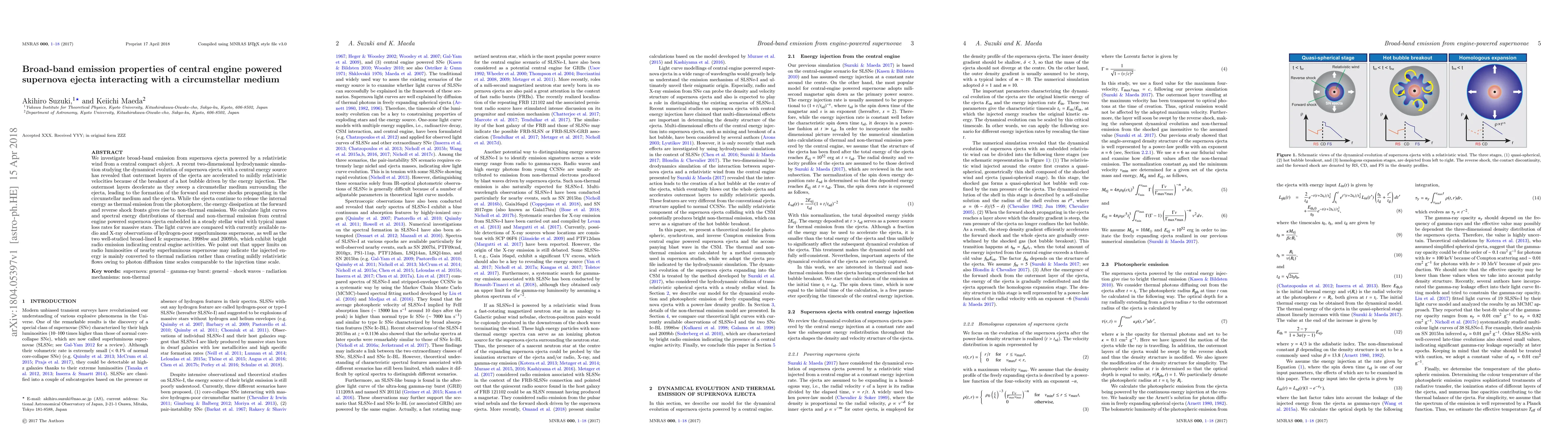 This paper investigates broad-band emission from supernova ejecta powered by a relativistic wind from a central compact object, revealing that the ejecta's interaction with a circumstellar medium generates both thermal and non-thermal emissions. The study compares calculated light curves and spectral energy distributions with observations of hydrogen-poor superluminous supernovae and broad-lined Ic supernovae, suggesting that nearby superluminous supernovae may convert injected energy primarily into thermal radiation.