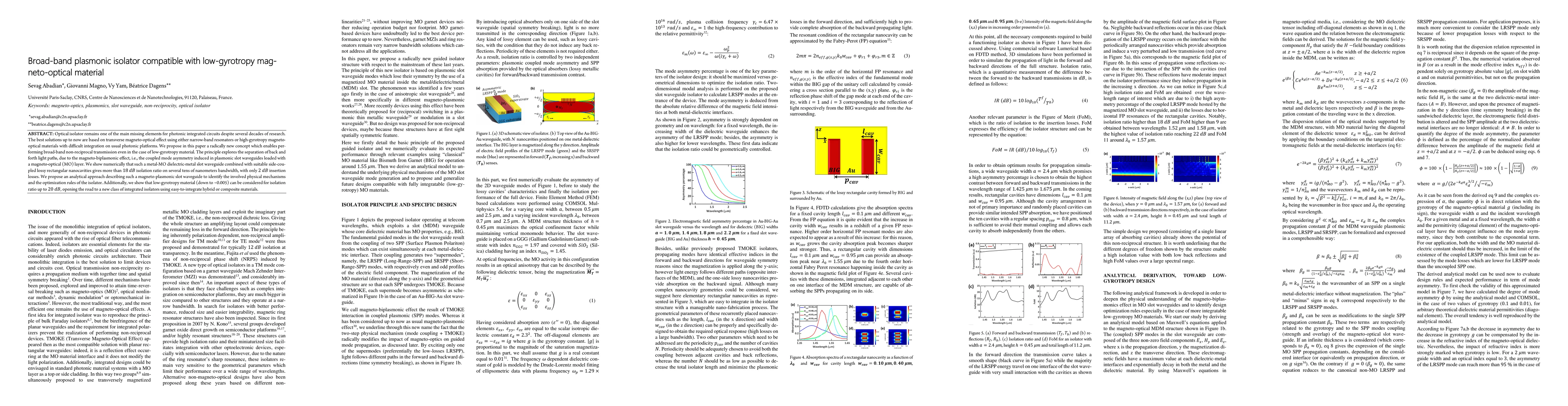 This research presents a novel concept for broad-band plasmonic isolators that are compatible with low-gyrotropy magneto-optical materials, addressing the limitations of previous designs by overcoming bandwidth and insertion loss issues.