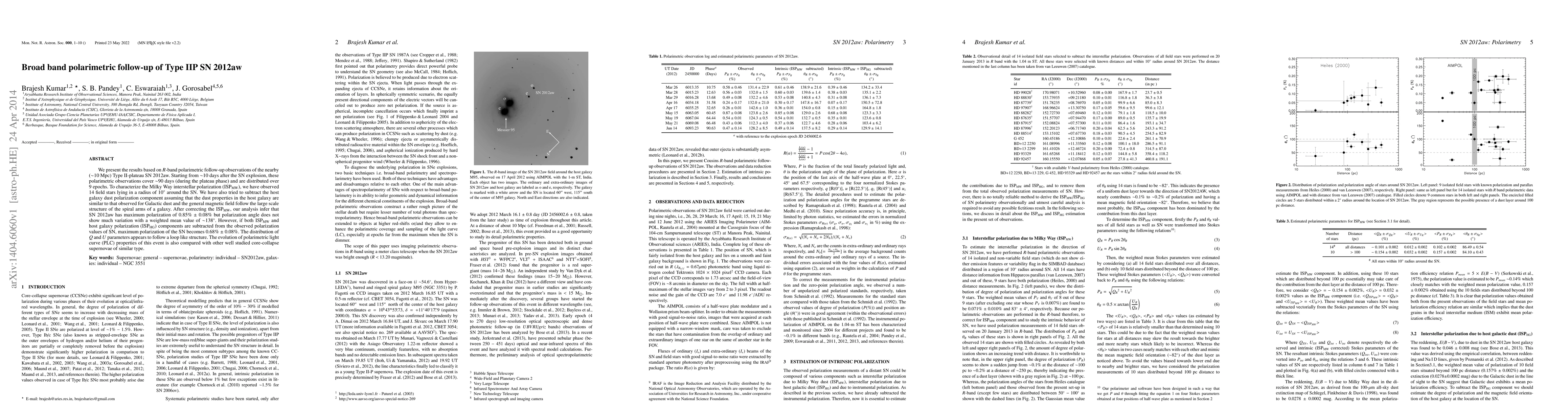 This paper reports on R-band polarimetric observations of Type II-plateau supernova SN 2012aw, revealing a maximum polarization of 0.85% ± 0.08% with minimal angle variation. After correcting for Milky Way and host galaxy dust polarization, the intrinsic SN polarization is estimated to be 0.68% ± 0.08%.