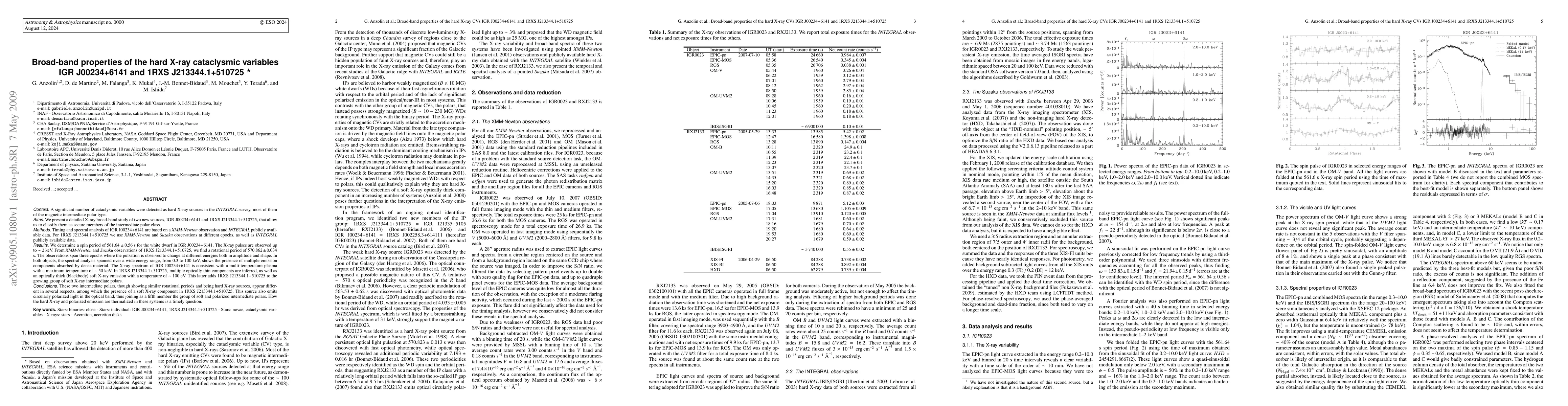 This paper presents a detailed X-ray broad-band study of two hard X-ray cataclysmic variables, IGR J00234+6141 and 1RXS J213344.1+510725, classifying them as intermediate polars. The study reveals spin periods of 561.64 s and 570.862 s for the white dwarfs, respectively, and identifies multiple emission components in their spectra, with IGR J00234+6141 showing a multi-temperature plasma and 1RXS J213344.1+510725 exhibiting a soft X-ray blackbody emission.