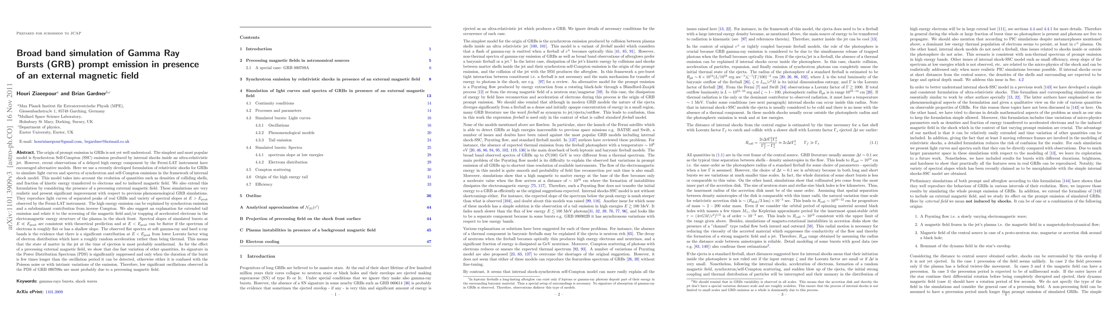 The origin of prompt emission in GRBs is not yet well understood. The simplest and most popular model is Synchrotron, Self-Compton (SSC) emission produced by internal shocks inside an ultra-relativistic jet. However, recent observations of a delayed high energy component have encouraged alternative models. Here we use a recently developed formulation of relativistic shocks to simulate GRBs. It takes into account the evolution of quantities such as densities of colliding shells, electric and magnetic fields. We also extend the previous formulation by considering a precessing external magnetic field. These simulations are very realistic and present significant improvement with respect to previous phenomenological GRB simulations. They reproduce light curves of separated peaks of real GRBs and variety of observed spectral slopes at E > E_{peak}. The high energy emission can be explained by synchrotron emission and a subdominant contribution from inverse Compton. We also suggest an explanation for the extended tail emission observed by the Fermi-LAT instrument and relate it to the screening of the magnetic field and/or trapping of accelerated electrons in the electromagnetic energy structure of the plasma in the shock front. Spectral slopes of simulated bursts at E << E_{peak} are consistent with theoretical prediction and at E < E_{peak} can be flatter if the spectrum of electrons is roughly flat or has a shallow slope. The observed flat spectra at soft gamma-ray and hard x-ray bands is the evidence that there is a significant contribution at $E < E_{peak}$ from lower Lorentz factor wing of electrons distribution which have a roughly random acceleration rather than being thermal. This means that the state of matter in the jet at the time of ejection is most probably nonthermal and electrons have a shallow spectrum at low energies.(abbreviated)