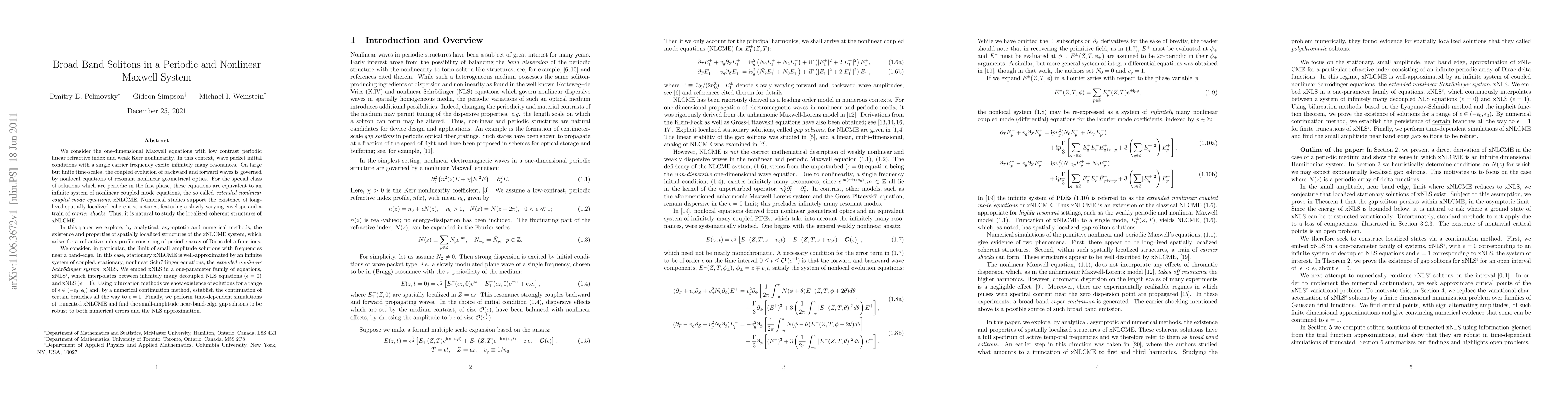 We consider the one-dimensional Maxwell equations with low contrast periodic linear refractive index and weak Kerr nonlinearity. In this context, wave packet initial conditions with a single carrier frequency excite infinitely many resonances. On large but finite time-scales, the coupled evolution of backward and forward waves is governed by nonlocal equations of resonant nonlinear geometrical optics. For the special class of solutions which are periodic in the fast phase, these equations are equivalent to an infinite system of nonlinear coupled mode equations, the so called it extended nonlinear coupled mode equations, xNLCME. Numerical studies support the existence of long-lived spatially localized coherent structures, featuring a slowly varying envelope and a train of carrier shocks. In this paper we explore, by analytical, asymptotic and numerical methods, the existence and properties of spatially localized structures of the xNLCME system, which arises for a refractive index profile consisting of periodic array of Dirac delta functions. We consider the limit of small amplitude solutions with frequencies near a band-edge. In this case, stationary xNLCME is well-approximated by an infinite system of coupled, stationary, nonlinear Schr\"odinger equations, the extended nonlinear Schr\"odinger system, xNLS. We embed xNLS in a one-parameter family of equations, xNLS$^\epsilon$, which interpolates between infinitely many decoupled NLS equations ($\epsilon=0$) and xNLS ($\epsilon=1$). Using bifurcation methods we show existence of solutions for a range of $\epsilon\in(-\epsilon_0,\epsilon_0)$ and, by a numerical continuation method, establish the continuation of certain branches all the way to $\epsilon=1$. Finally, we perform time-dependent simulations of truncated xNLCME and find the small-amplitude solitons to be robust to both numerical errors and the NLS approximation.