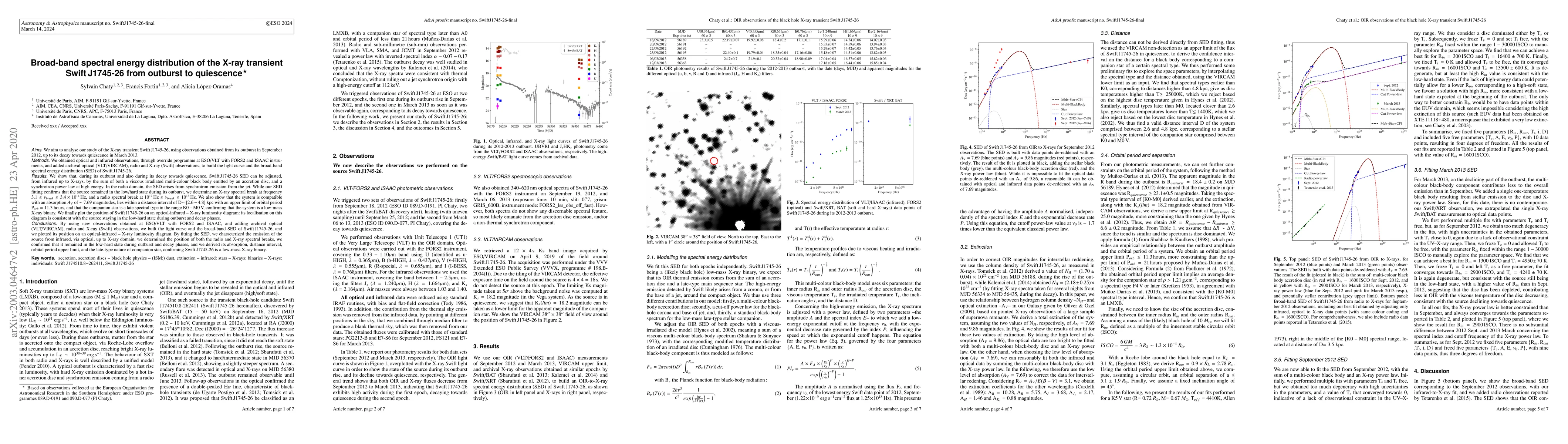 We study the X-ray transient Swift J1745-26, using observations obtained from its outburst in September 2012, up to its decay towards quiescence in March 2013. We obtained optical and infrared observations, through override programme at ESO/VLT with FORS2 and ISAAC instruments, and archival optical (VLT/VIRCAM), radio and X-ray (Swift) observations, to build the lightcurve and the broad-band Spectral Energy Distribution (SED) of Swift J1745-26. We show that, during its outburst and also during its decay towards quiescence, Swift J1745-26 SED can be adjusted, from infrared up to X-rays, by the sum of both a viscous irradiated multi-colour blackbody emitted by an accretion disk, and a synchrotron powerlaw at high energy. In the radio domain, the SED arises from synchrotron emission from the jet. While our SED fitting confirms that the source remained in the low/hard state during its outburst, we determine an X-ray spectral break at frequency 3.1 < nu_break < 3.4 x 10^14 Hz, and a radio spectral break at 10^12 Hz < nu_break < 10^13 Hz. We also show that the system is compatible with an absorption Av of ~7.69 magnitudes, lies within a distance interval of D~[2.6-4.8] kpc, with an upper limit of orbital period P_orb = 11.3 hours, and that the companion star is a late-type star of spectral type in the range K0 - M0 V, confirming that the system is a low-mass X-ray binary. We finally plot the position of Swift J1745-26 on an optical-infrared - X-ray luminosity diagram: its localization on this diagram is consistent with the source staying in the low-hard state during outburst and decay phases.