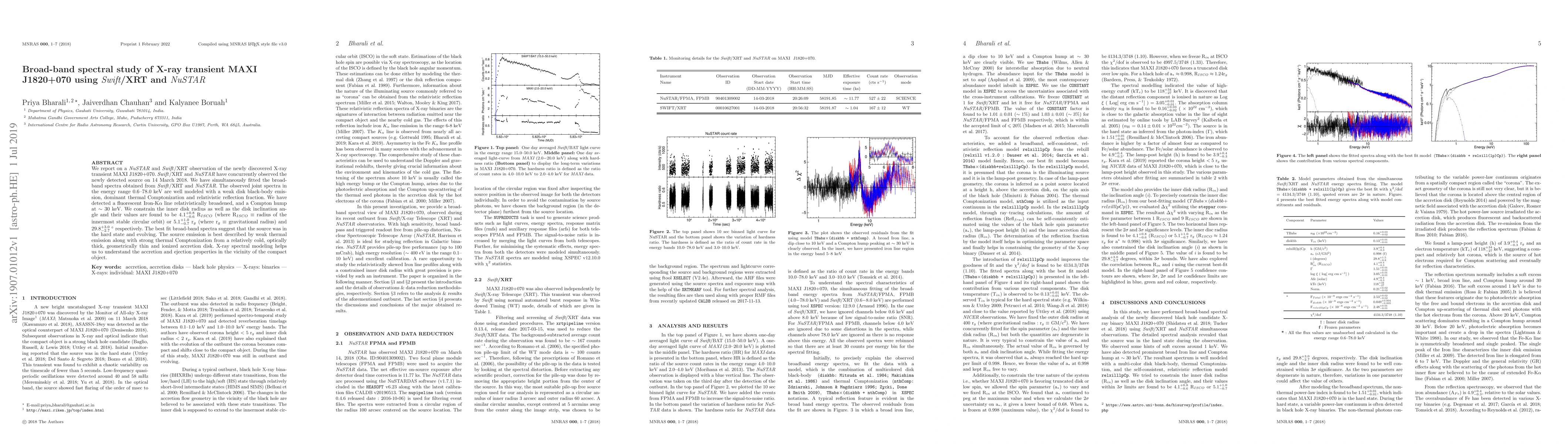 We report on a \textit{NuSTAR} and \textit{Swift}/XRT observation of the newly discovered X-ray transient MAXI J1820+070. \textit{Swift}/XRT and \textit{NuSTAR} have concurrently observed the newly detected source on 14 March 2018. We have simultaneously fitted the broad-band spectra obtained from \textit{Swift}/XRT and \textit{NuSTAR}. The observed joint spectra in the energy range 0.6--78.0 keV are well modeled with a weak disk black-body emission, dominant thermal Comptonization and relativistic reflection fraction. We have detected a fluorescent Iron-K$\alpha$ line relativistically broadened, and a Compton hump at $\sim$ 30 keV. We constrain the inner disk radius as well as the disk inclination angle and their values are found to be 4.1$^{+0.8}_{-0.6}$ R$_{ISCO}$ (where R$_{ISCO}\equiv$ radius of the innermost stable circular orbit) or 5.1$^{+1.0}_{-0.7}$ r$_{g}$ (where r$_{g}\equiv$ gravitational radius) and 29.8$^{+3.0}_{-2.7}$ $^\circ$ respectively. The best fit broad-band spectra suggest that the source was in the hard state and evolving. The source emission is best described by weak thermal emission along with strong thermal Comptonization from a relatively cold, optically thick, geometrically thin and ionized accretion disk. X-ray spectral modeling helps us to understand the accretion and ejection properties in the vicinity of the compact object.