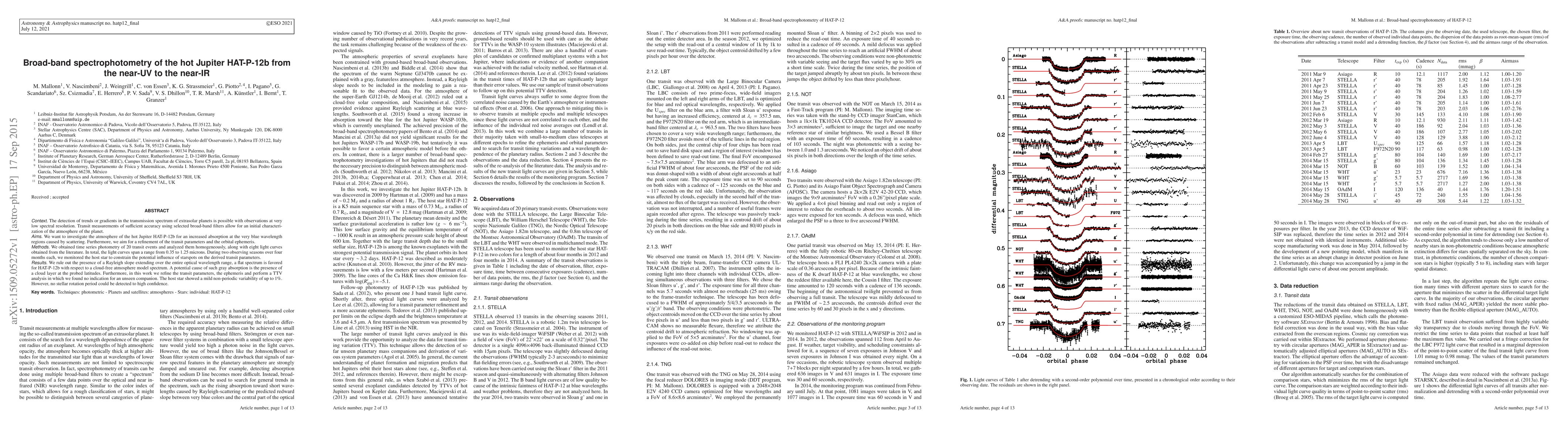 The detection of trends or gradients in the transmission spectrum of extrasolar planets is possible with observations at very low spectral resolution. Transit measurements of sufficient accuracy using selected broad-band filters allow for an initial characterization of the atmosphere of the planet. We obtained time series photometry of 20 transit events and analyzed them homogeneously, along with eight light curves obtained from the literature. In total, the light curves span a range from 0.35 to 1.25 microns. During two observing seasons over four months each, we monitored the host star to constrain the potential influence of starspots on the derived transit parameters. We rule out the presence of a Rayleigh slope extending over the entire optical wavelength range, a flat spectrum is favored for HAT-P-12b with respect to a cloud-free atmosphere model spectrum. A potential cause of such gray absorption is the presence of a cloud layer at the probed latitudes. Furthermore, in this work we refine the transit parameters, the ephemeris and perform a TTV analysis in which we found no indication for an unseen companion. The host star showed a mild non-periodic variability of up to 1%. However, no stellar rotation period could be detected to high confidence.