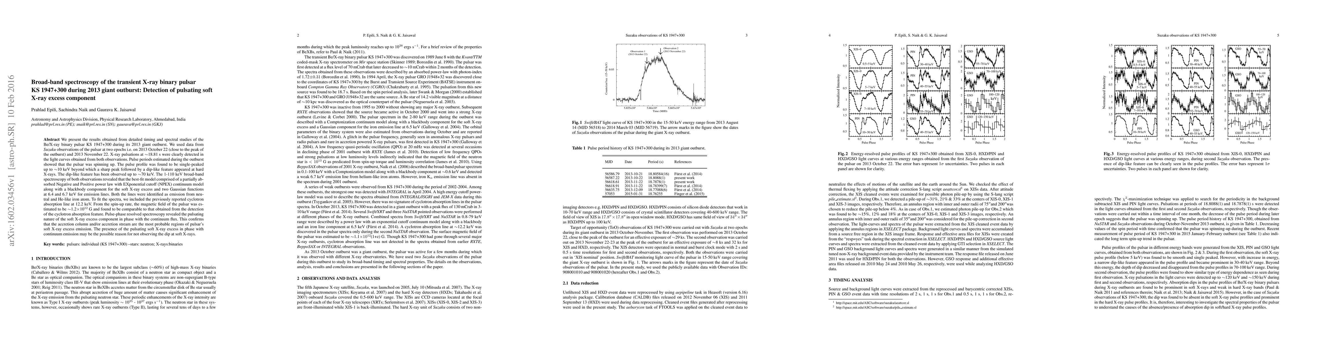 We present the results obtained from detailed timing and spectral studies of the Be/X-ray binary pulsar KS 1947+300 during its 2013 giant outburst. We used data from Suzaku observations of the pulsar at two epochs i.e. on 2013 October 22 (close to the peak of the outburst) and 2013 November 22. X-ray pulsations at $\sim$18.81 s were clearly detected in the light curves obtained from both observations. Pulse periods estimated during the outburst showed that the pulsar was spinning up. The pulse profile was found to be single-peaked up to $\sim$10 keV beyond which a sharp peak followed by a dip-like feature appeared at hard X-rays. The dip-like feature has been observed up to $\sim$70 keV. The 1-110 keV broad-band spectroscopy of both observations revealed that the best-fit model comprised of a partially absorbed Negative and Positive power law with EXponential cutoff (NPEX) continuum model along with a blackbody component for the soft X-ray excess and two Gaussian functions at 6.4 and 6.7 keV for emission lines. Both the lines were identified as emission from neutral and He-like iron atom. To fit the spectra, we included the previously reported cyclotron absorption line at 12.2 keV. From the spin-up rate, the magnetic field of the pulsar was estimated to be $\sim$1.2$\times$10$^{12}$ G and found to be comparable to that obtained from the detection of the cyclotron absorption feature. Pulse-phase resolved spectroscopy revealed the pulsating nature of the soft X-ray excess component in phase with the continuum flux. This confirms that the accretion column and/or accretion stream are the most probable regions of pulsar's soft X-ray excess emission. The presence of the pulsating soft X-ray excess in phase with continuum emission may be the possible reason for not observing the dip at soft X-rays.