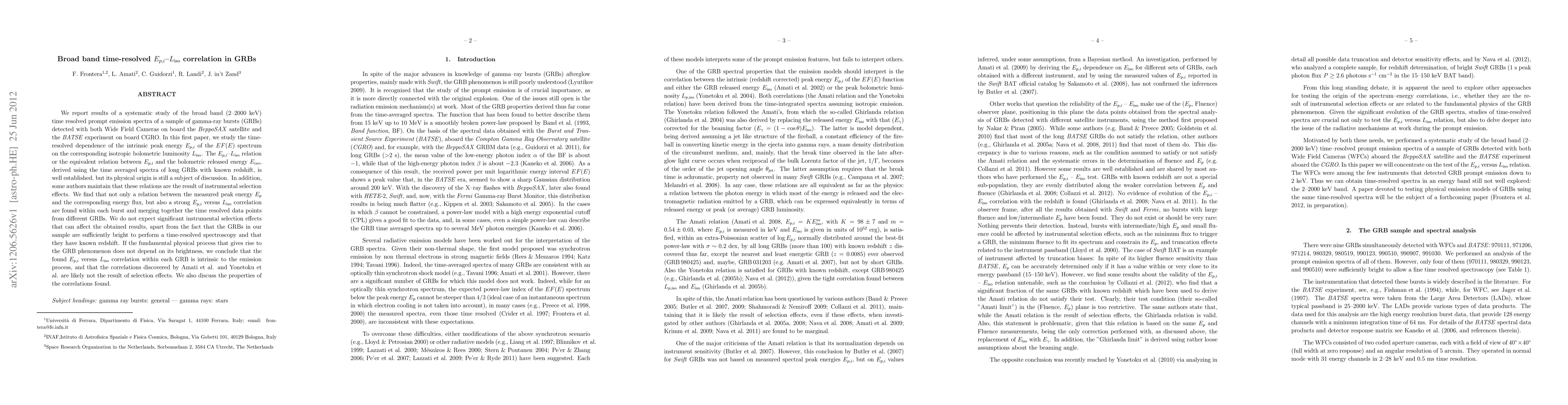 We report results of a systematic study of the broad band (2--2000 keV) time resolved prompt emission spectra of a sample of gamma-ray bursts (GRBs) detected with both Wide Field Cameras on board the \sax\ satellite and the \batse\ experiment on board CGRO. In this first paper, we study the time-resolved dependence of the intrinsic peak energy $E_{p,i}$ of the $E F(E)$ spectrum on the corresponding isotropic bolometric luminosity $L_{\rm iso}$. The $E_{p,i}$--$L_{\rm iso}$ relation or the equivalent relation between $E_{p,i}$ and the bolometric released energy $E_{iso}$, derived using the time averaged spectra of long GRBs with known redshift, is well established, but its physical origin is still a subject of discussion. In addition, some authors maintain that these relations are the result of instrumental selection effects. We find that not only a relation between the measured peak energy $E_p$ and the corresponding energy flux, but also a strong $E_{p,i}$ versus $L_{\rm iso}$ correlation are found within each burst and merging together the time resolved data points from different GRBs. We do not expect significant instrumental selection effects that can affect the obtained results, apart from the fact that the GRBs in our sample are sufficiently bright to perform a time-resolved spectroscopy and that they have known redshift. If the fundamental physical process that gives rise to the GRB phenomenon does not depend on its brightness, we conclude that the found $E_{p,i}$ versus $L_{\rm iso}$ correlation within each GRB is intrinsic to the emission process, and that the correlations discovered by Amati et al. and Yonetoku et al. are likely not the result of selection effects. We also discuss the properties of the correlations found.