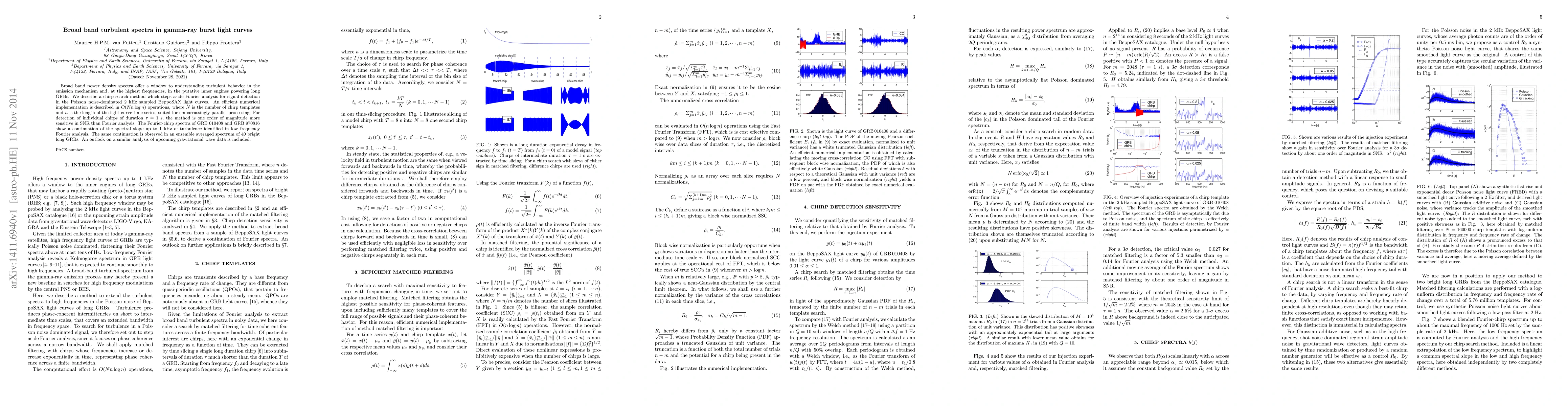 Broad band power density spectra offer a window to understanding turbulent behavior in the emission mechanism and, at the highest frequencies, in the putative inner engines powering long GRBs. We describe a chirp search method which steps aside Fourier analysis for signal detection in the Poisson noise-dominated 2 kHz sampled BeppoSAX light curves. An efficient numerical implementation is described in $O(Nn\log n)$ operations, where $N$ is the number of chirp templates and $n$ is the length of the light curve time series, suited for embarrassingly parallel processing. For detection of individual chirps of duration $\tau=1$ s, the method is one order of magnitude more sensitive in SNR than Fourier analysis. The Fourier-chirp spectra of GRB 010408 and GRB 970816 show a continuation of the spectral slope up to 1 kHz of turbulence identified in low frequency Fourier analysis. The same continuation is observed in an ensemble averaged spectrum of 40 bright long GRBs. An outlook on a similar analysis of upcoming gravitational wave data is included.