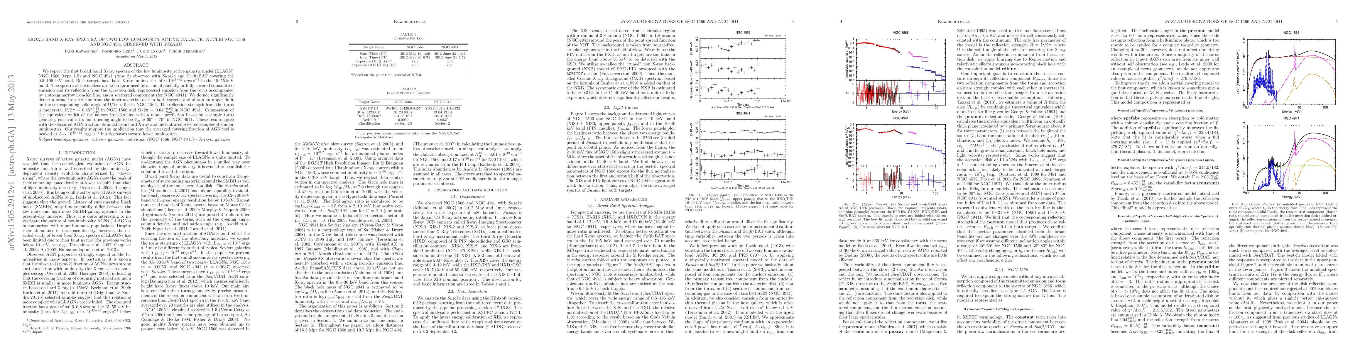 This study presents broad band X-ray spectra of low-luminosity active galactic nuclei NGC 1566 and NGC 4941, revealing hard X-ray luminosities around 10^{41-42} ergs/s. The observed spectra are well explained by a combination of reflected and scattered emission, with no significant detection of broad iron-K\alpha lines, indicating a moderate covering fraction of AGN tori.