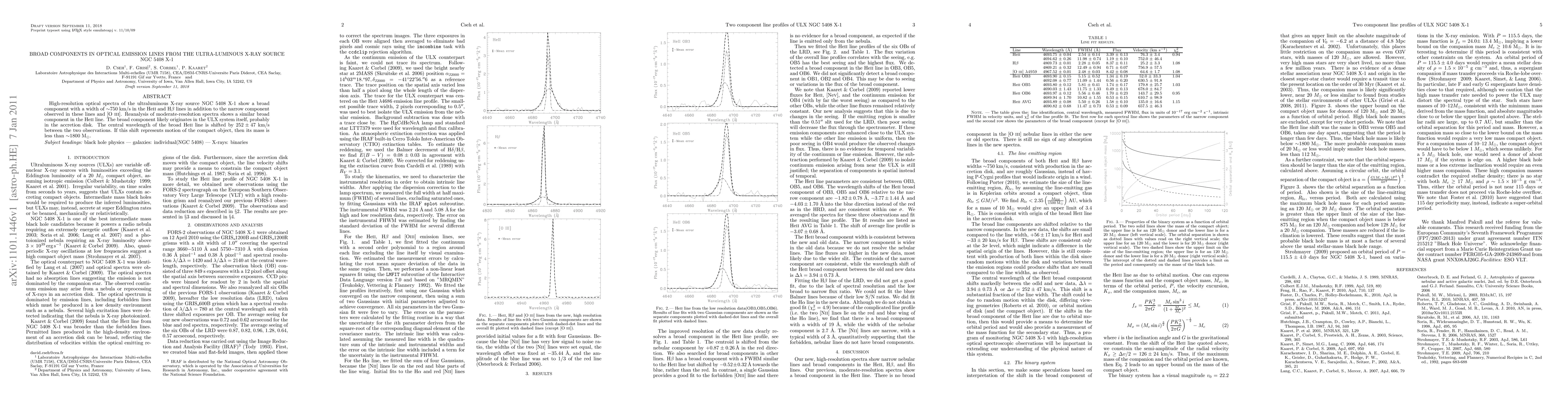High-resolution optical spectra of the ultraluminous X-ray source NGC 5408 X-1 show a broad component with a width of ~750 km/s in the HeII and Hbeta lines in addition to the narrow component observed in these lines and [O III]. Reanalysis of moderate-resolution spectra shows a similar broad component in the HeII line. The broad component likely originates in the ULX system itself, probably in the accretion disk. The central wavelength of the broad HeII line is shifted by 252 \pm 47 km/s between the two observations. If this shift represents motion of the compact object, then its mass is less than ~1800 M_sun.