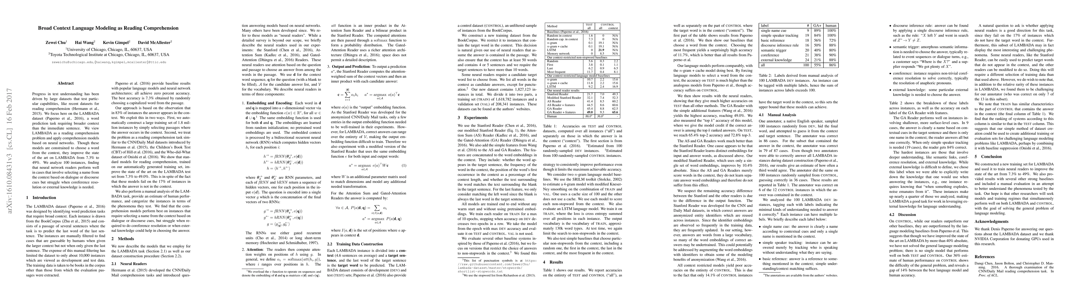 This paper explores neural network models for reading comprehension using the LAMBADA dataset, which tests broader context understanding. The models improve state-of-the-art word prediction performance from 7.3% to 49%, but struggle with coreference resolution and external knowledge.